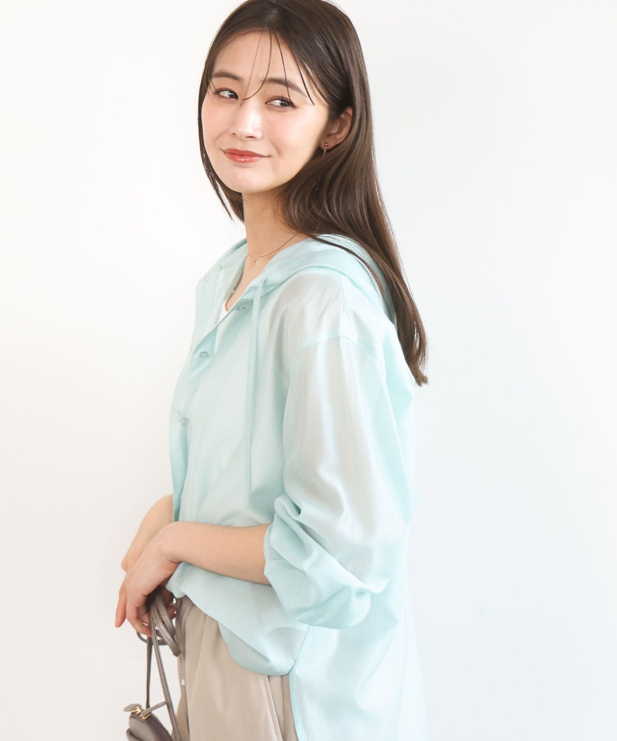 フーディーデザインのシアーシャツブラウスは、トレンド感あふれるフード付きで、前後差のある丈とゆったりシルエットがこなれた印象をもたらします。