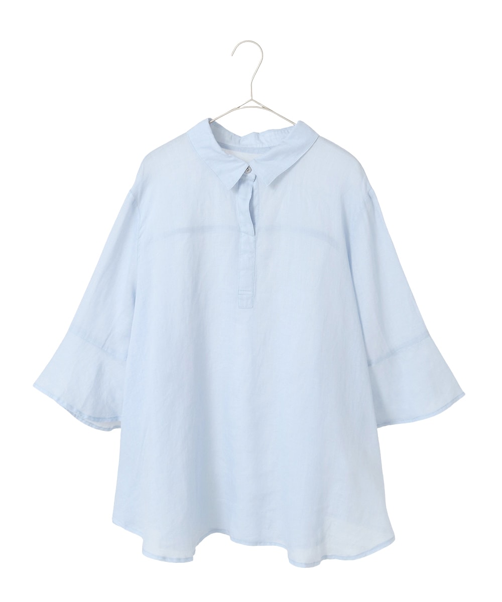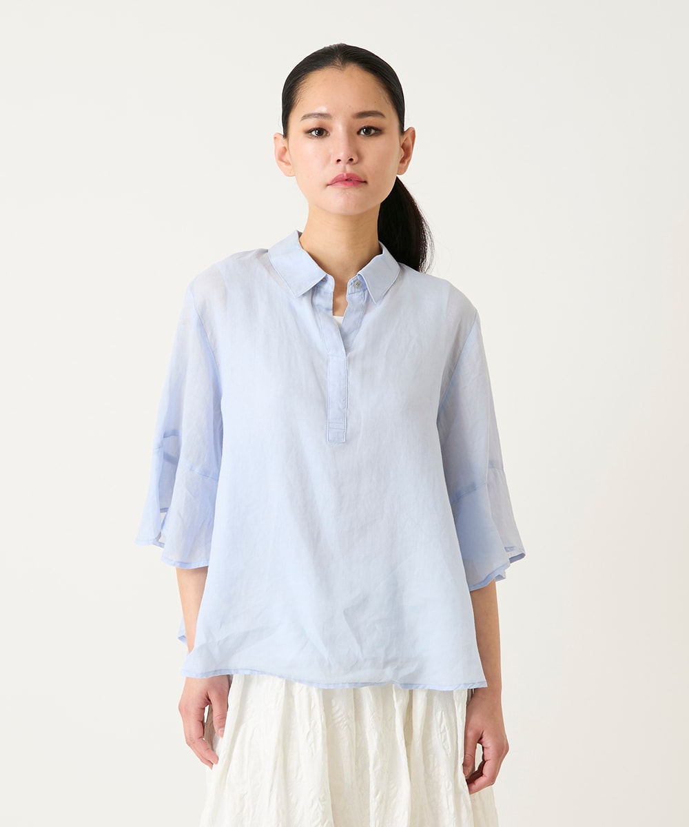 ブラウスは麻100%です。薄手で、とたも柔らかい生地です。麻特有のゴワつきもなく、柔らかいので、とても肌ざりが良くて、着心地が良いです。ワンサイズ作りでゆったりとしています。袖のデザインがフレアラインなので、涼しいです。私の体格でもレギュラーサイズで大丈夫でした。