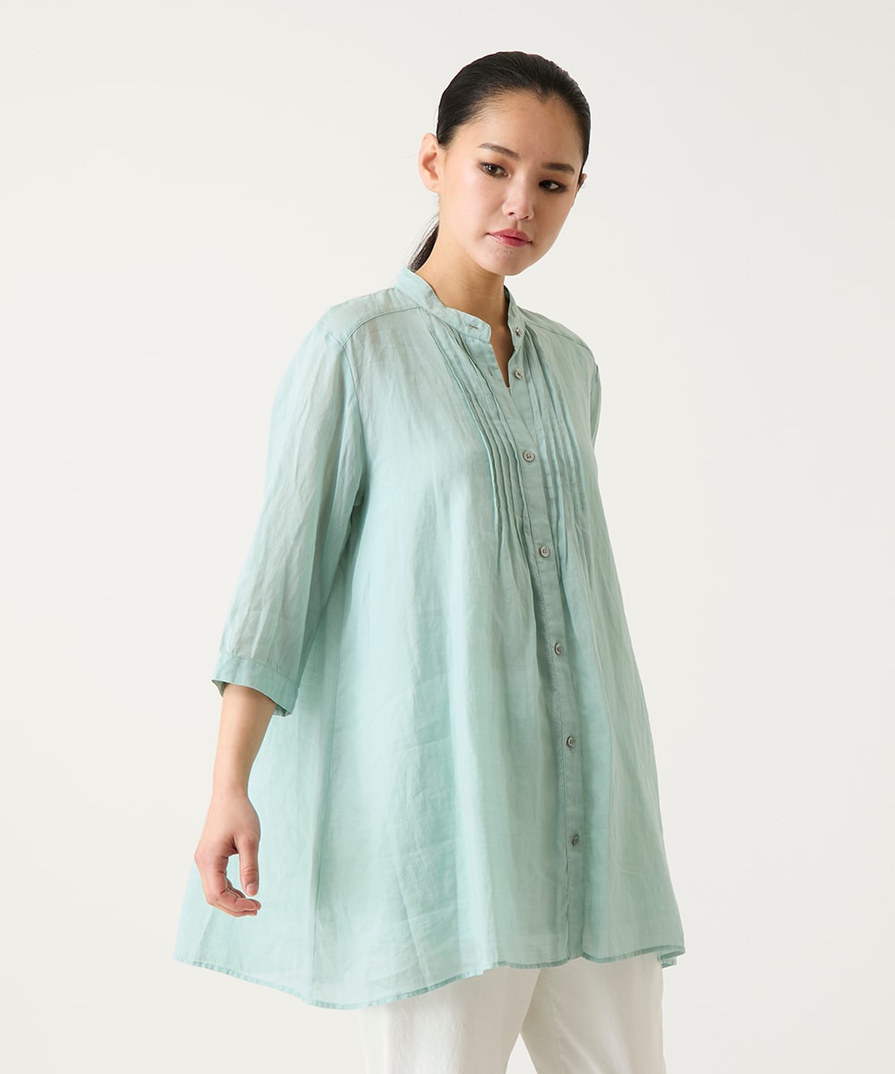 ブラウスはチュニック丈で体型カバーバッチリです。7分袖で長い季節使えると思います。ピンタックが良いアクセントになっています。