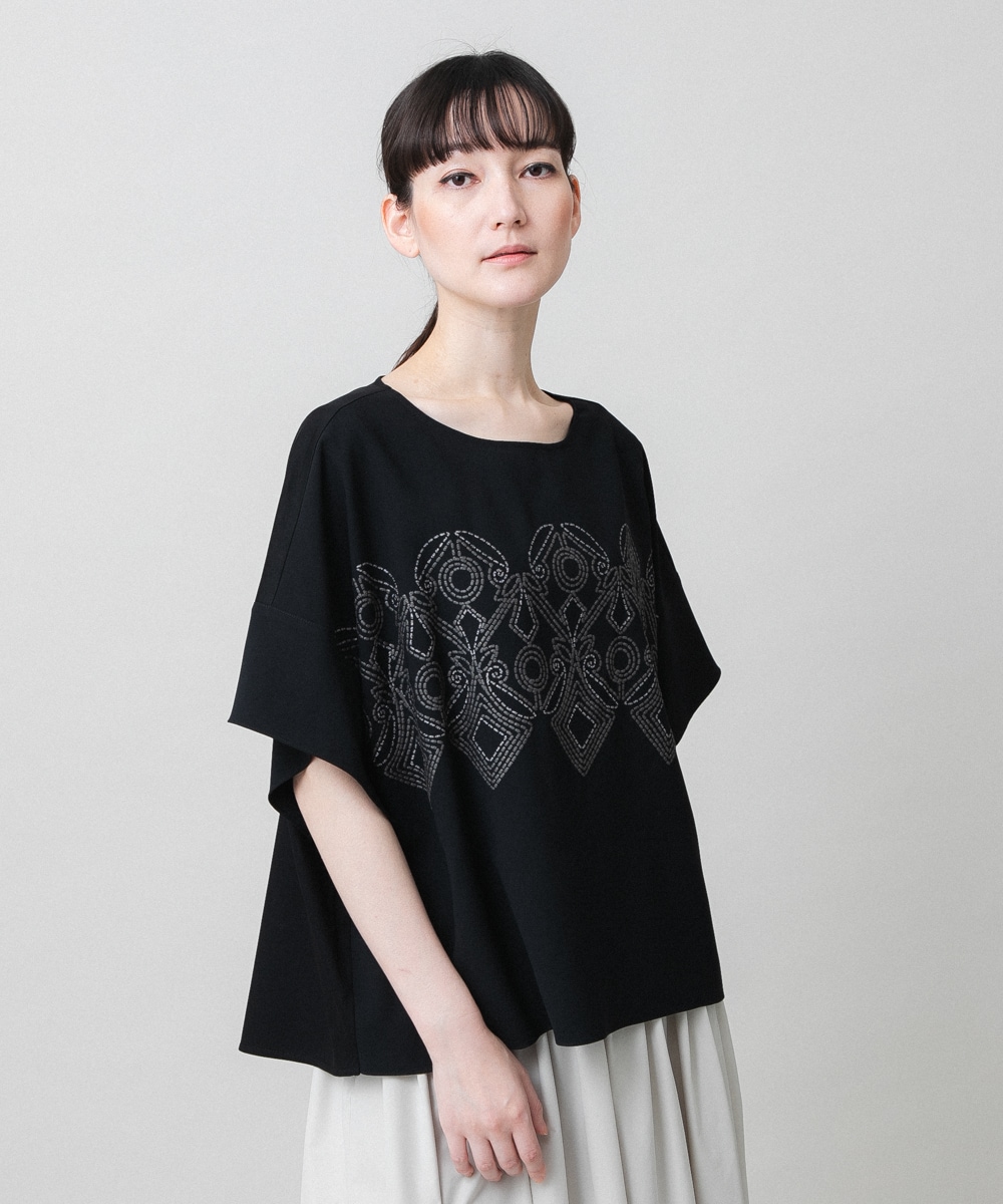 幾何プリントカットソーはラメや発泡プリントで表現した幾何柄モチーフが立体的で存在感と雰囲気のある着映えのするデザインです。程よいゆったりとしたサイズ感でバランスが良く…ボトムスを選ばないので色々なスタイリングが楽しめヘビロテ間違いなしでおススメです。