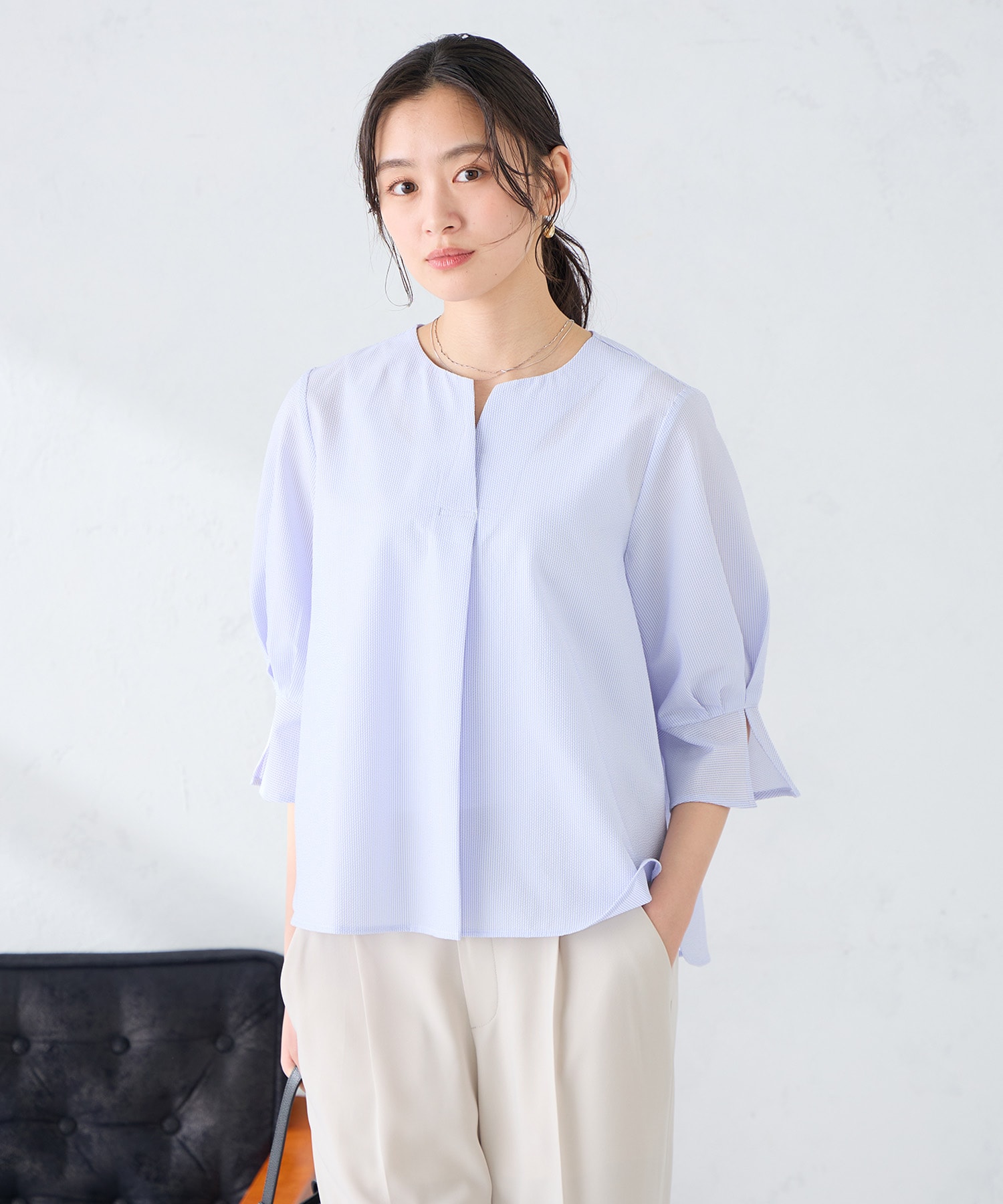 ハリのあるさらさらブラウスはきれいめにもカジュアルにも使えるアイテムです(b・ω・)b