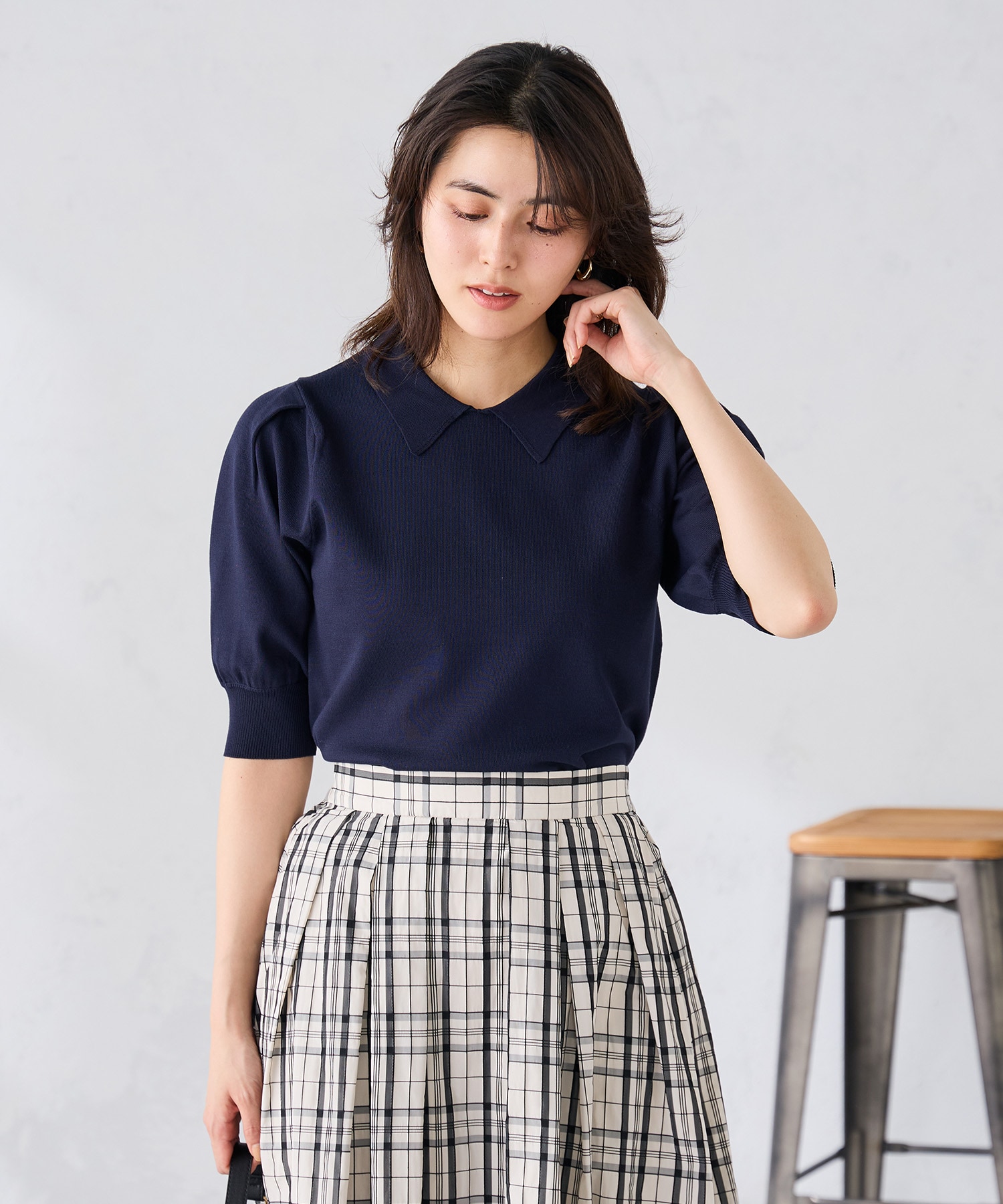 ポロシャツ風ニットを使ったシンプルコーデ。