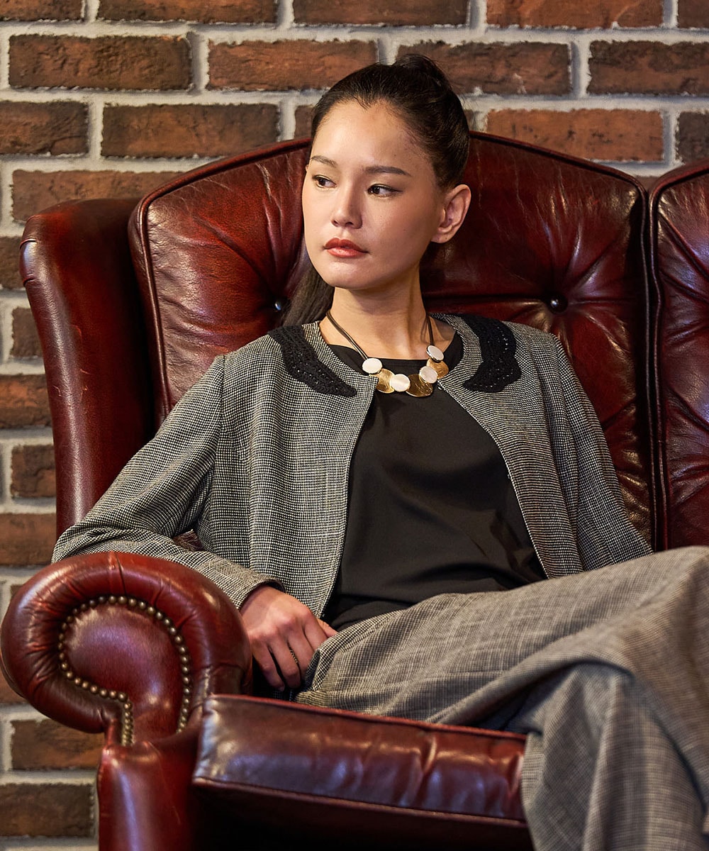襟元のレースがほんのり甘めの雰囲気。