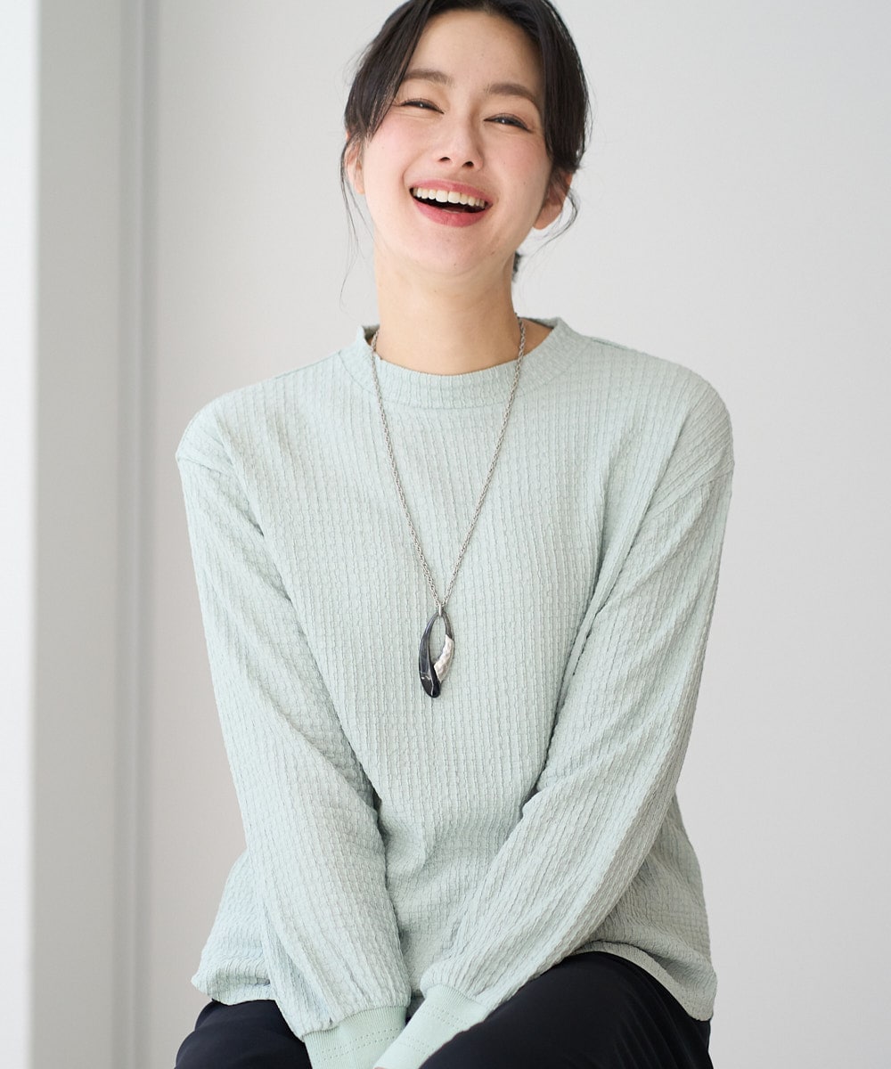 顔周りをすっきりと見せてくれますグリーンのカットソーは