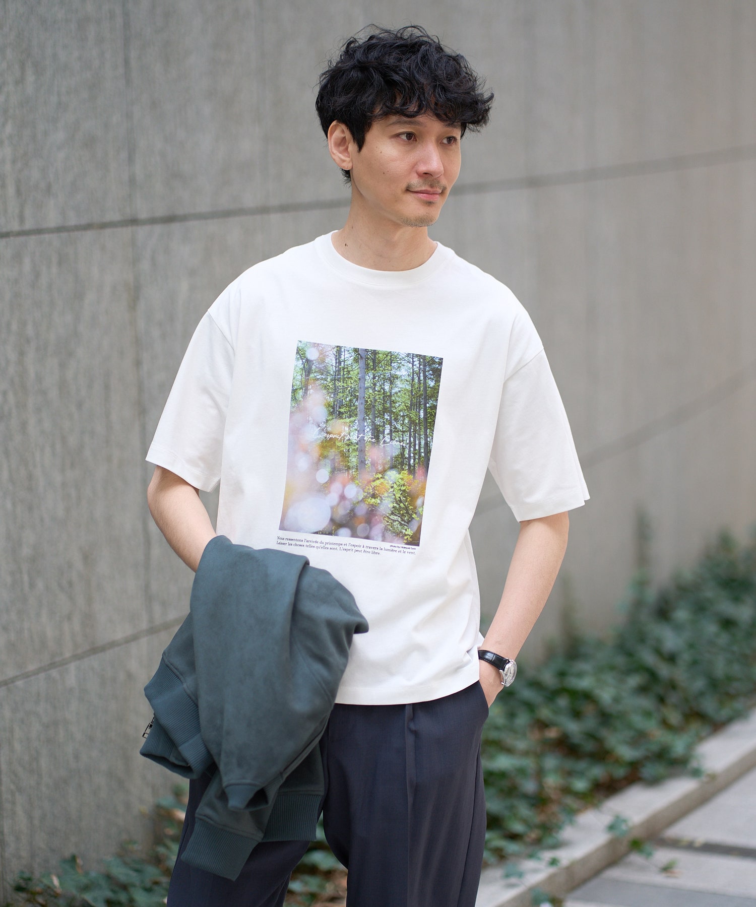 フォトグラファーHIDEYUKI SUTO氏とのコラボワイドシルエットカットソーは、早朝のアトリエの庭に映る新緑や植物の色彩を水と光の調和で表現した作品をフロントに配し、色のコントラストが絶妙なアクセントに。