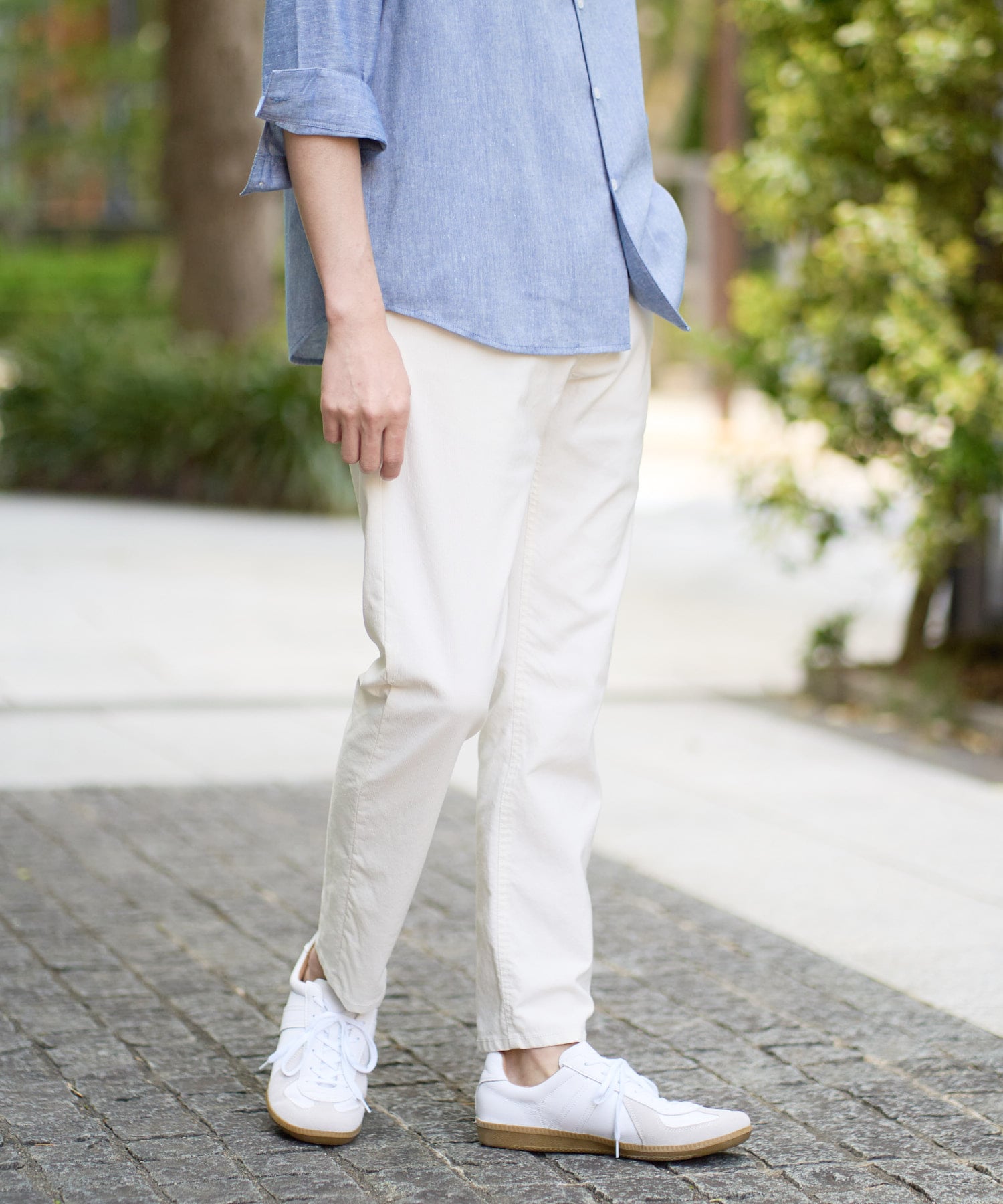 夏のコーデに映える【累計3万枚販売】ストレッチコードレーン5ポケットアンクル丈パンツは、忙しい毎日でも楽ちんに着こなせるイージーケアと速乾性を兼ね備えた優秀アイテム。