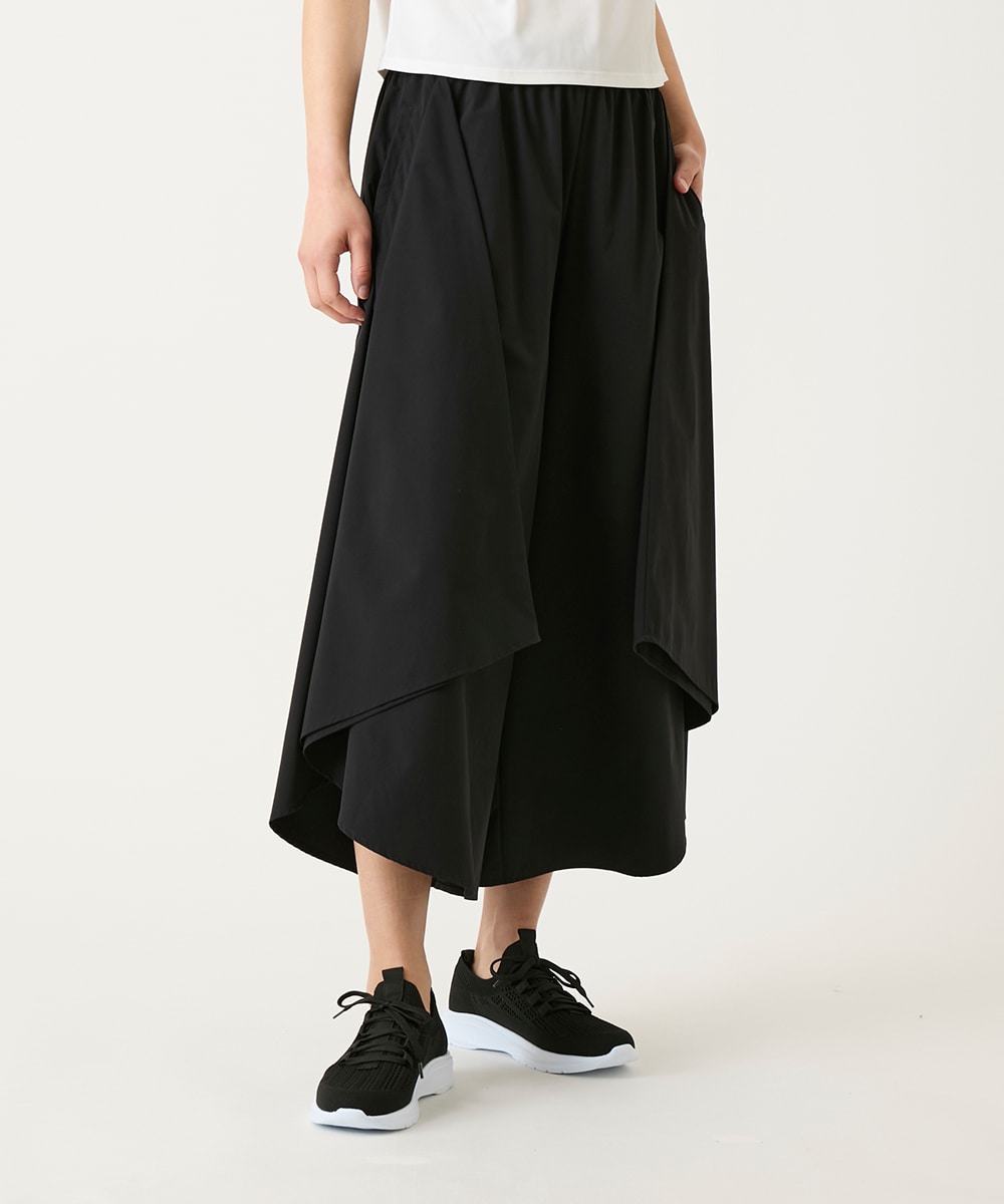ストレッチタフタのドレープフレアパンツは軽くてさらりとした履き心地です。個性的なデザインですのでトップスはシンプルに。