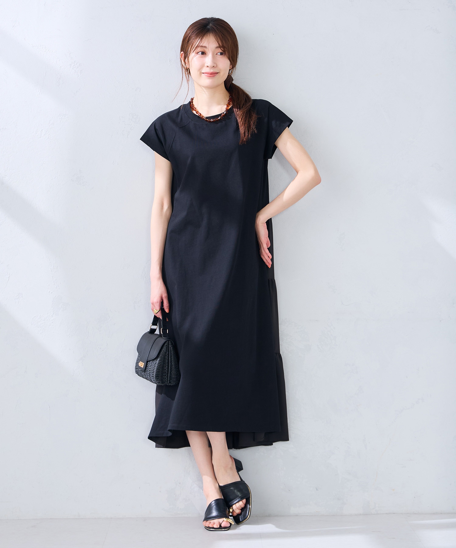 カットソー素材と布帛素材のドッキングになっていて、さらっとした着心地。
