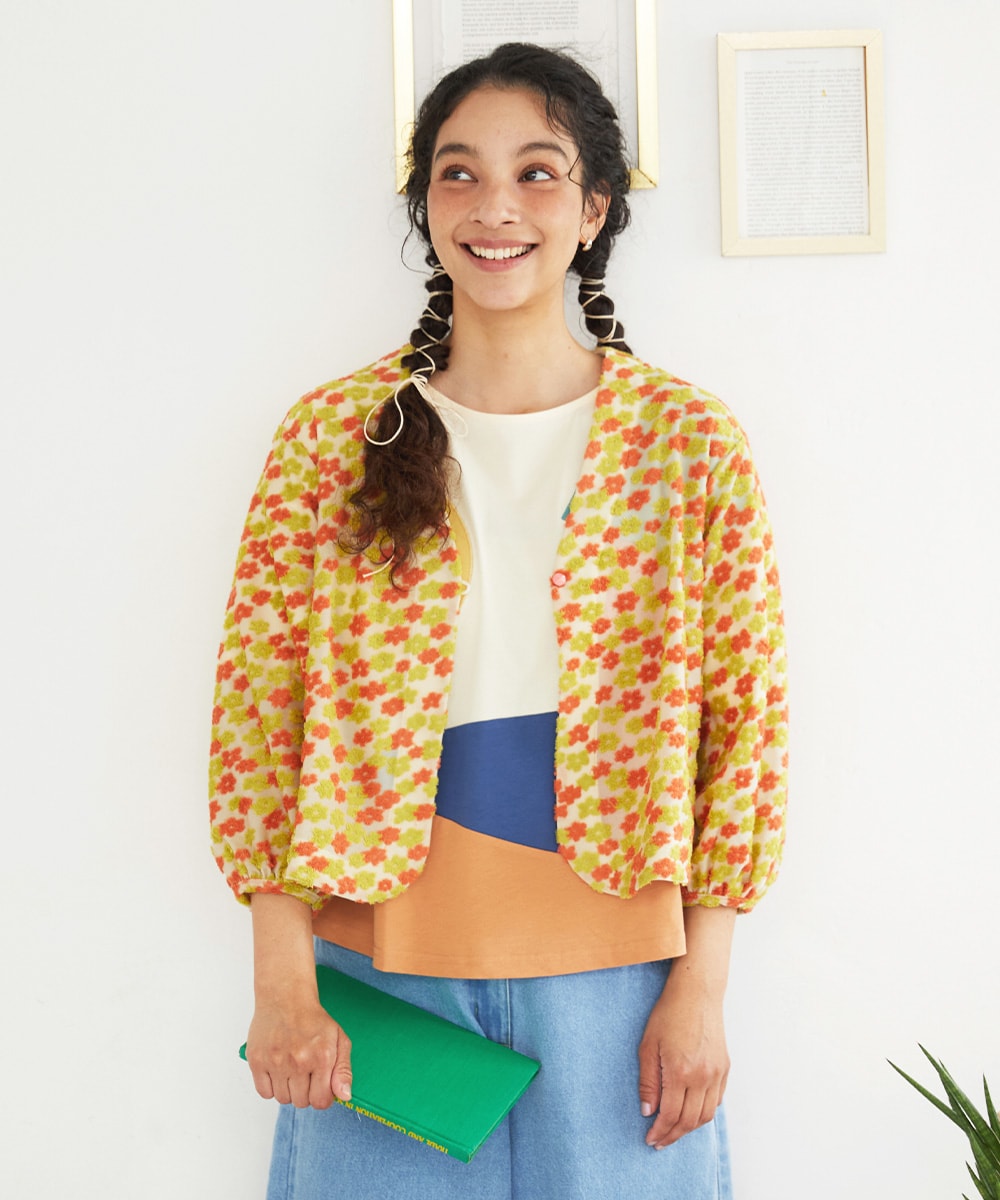 上品なシアー感のあり、ホコモモラらしい花柄のパイルジャカード。襟元がすっきり見えるV開きデザイン。ラウンドした裾のデザインで開けても閉じても綺麗なシルエットに。袖口にゴムを入れて、ふんわりとしたデザインです。