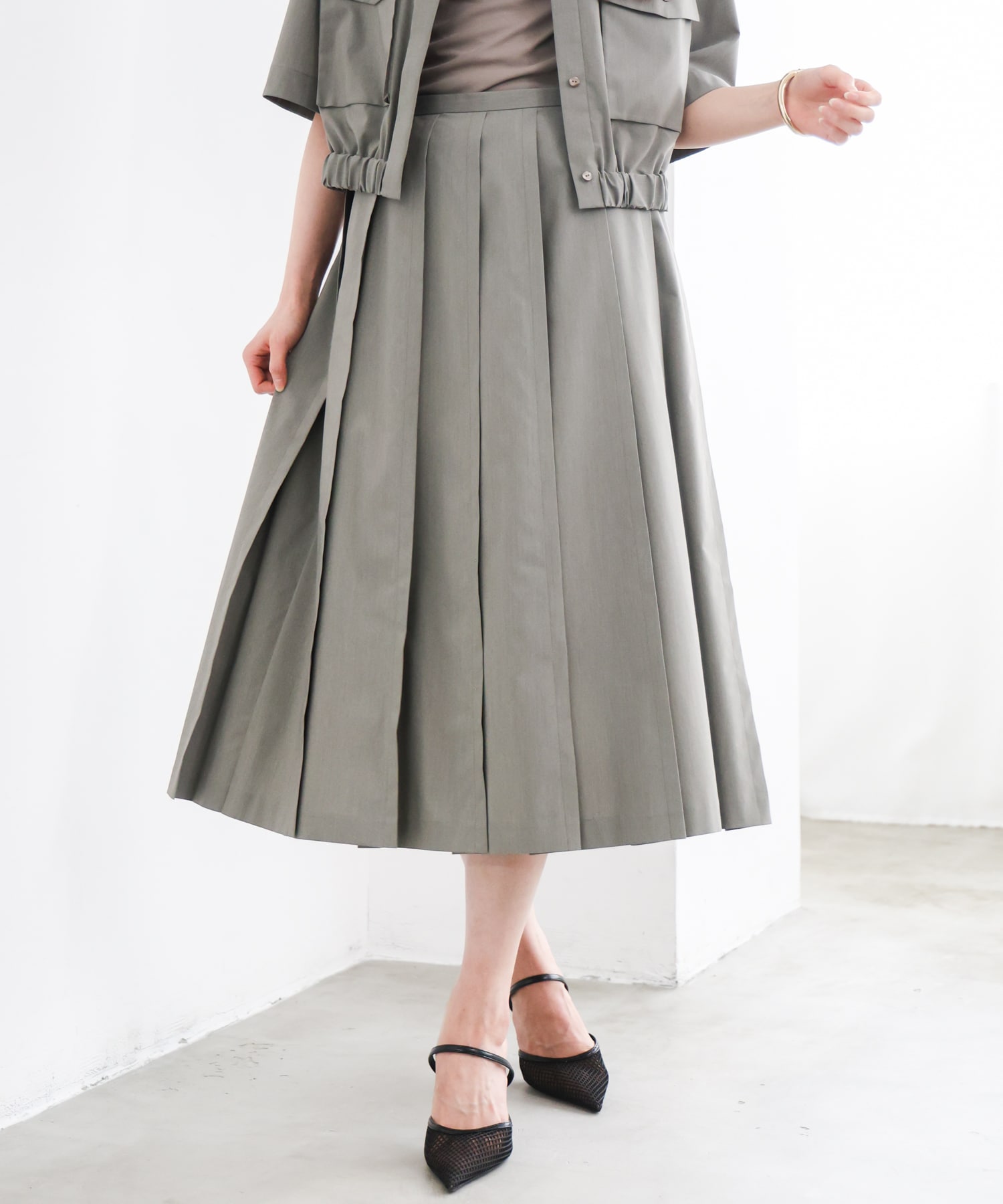 程良い艶のある素材のプリーツスカート、プリーツのデザインと落ち感のある素材でスッキリと着用できます。