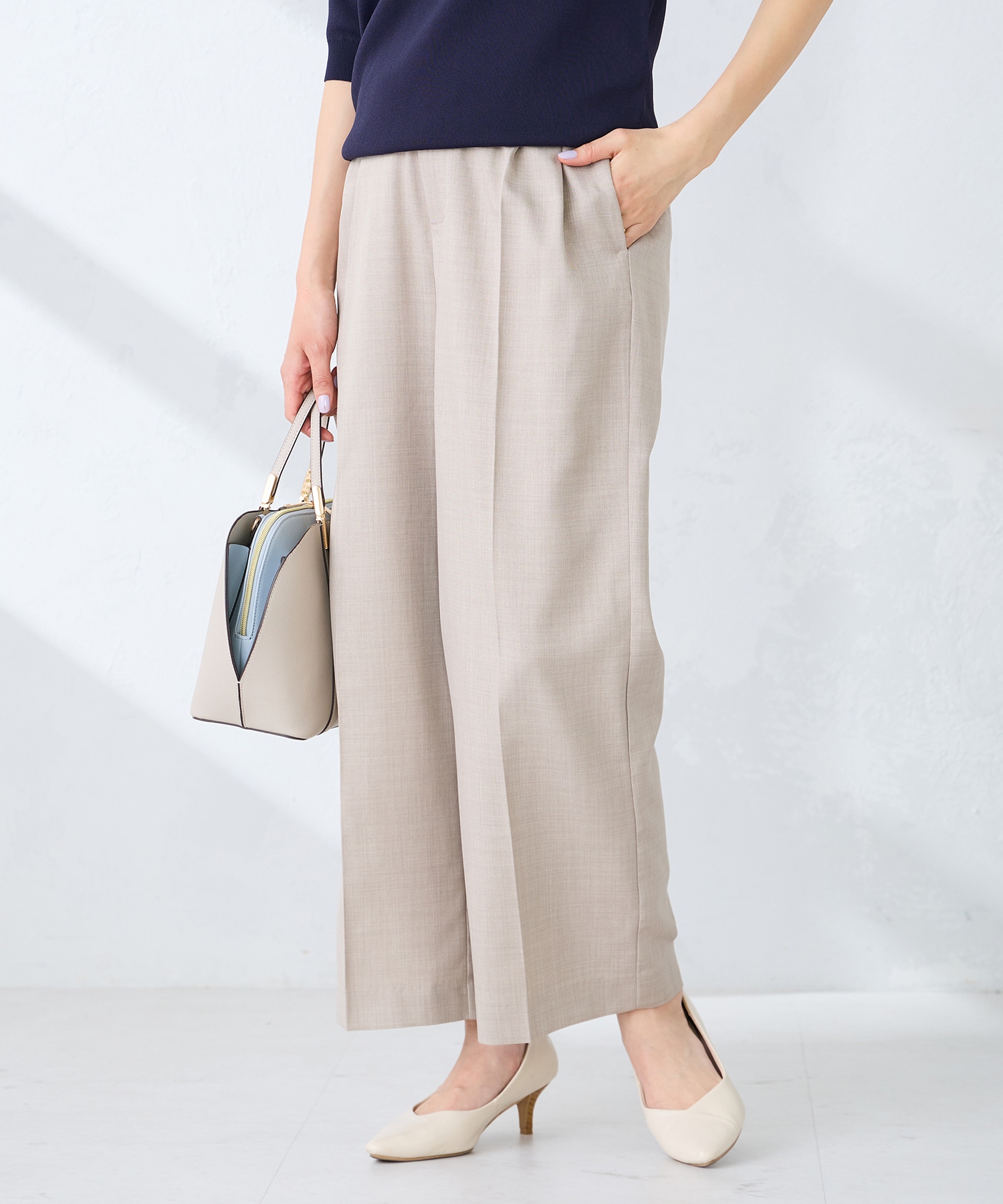ボトムのタックワイドパンツは上品なベージュです。タックが入っているのでスッキリ見えます。