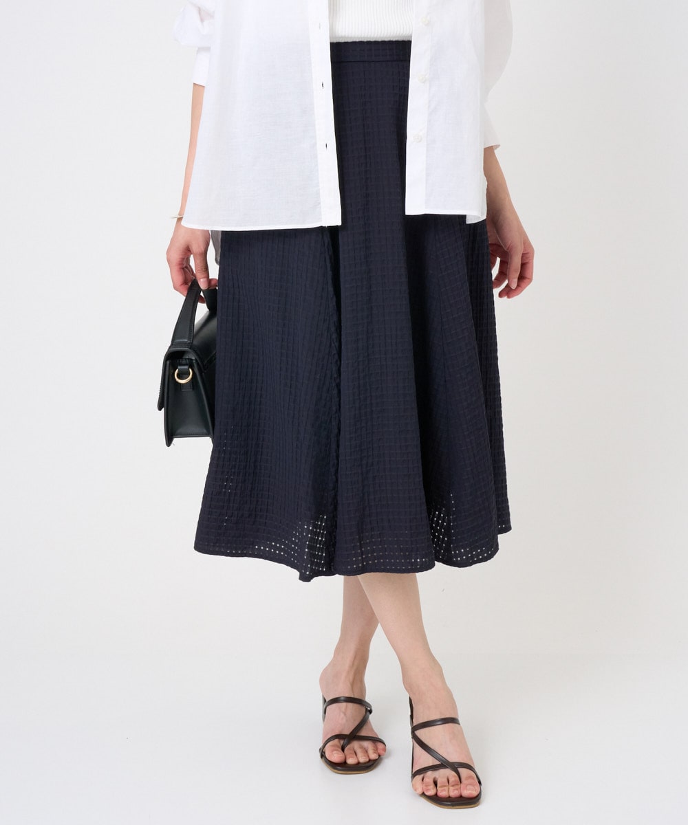 ポコポコとした凹凸感と部分的ね透け感が清涼感があり涼しげなシアーチェック柄タックスリーブブラウスと同素材のフレアスカートです。