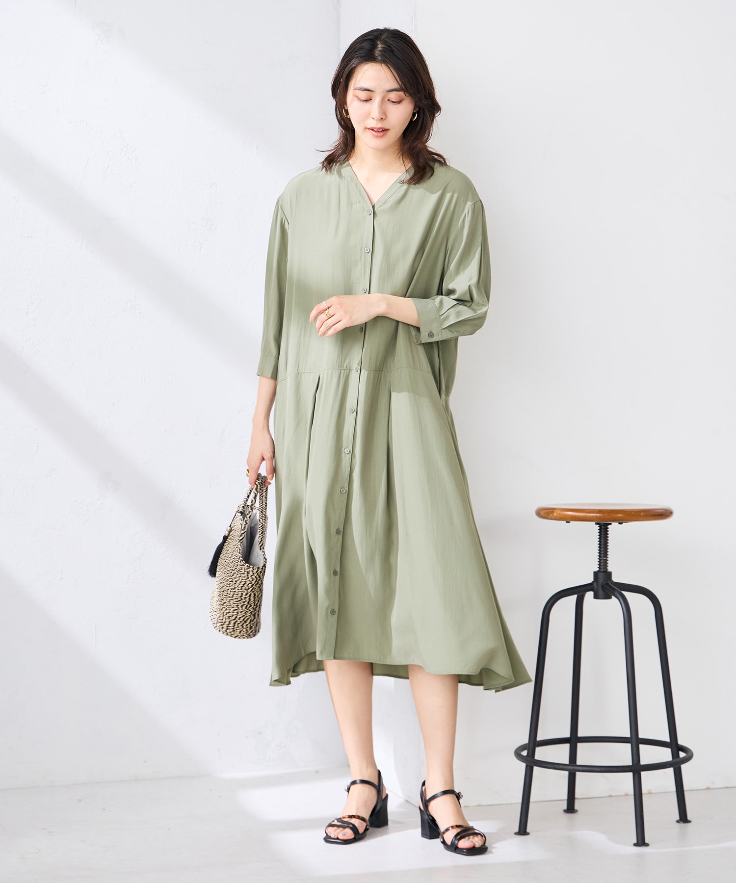 襟がないのでスッキリとした印象&程よく広がるフレアデザインでキレイなシルエットに◎