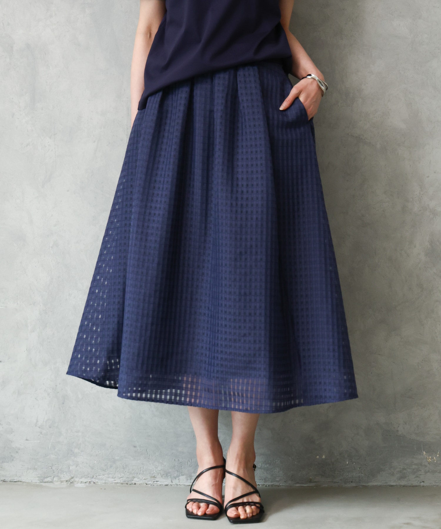 程よいハリ感とほんのりシアー感のあるチェックジャガード素材が目を引くタックフレアスカート。
