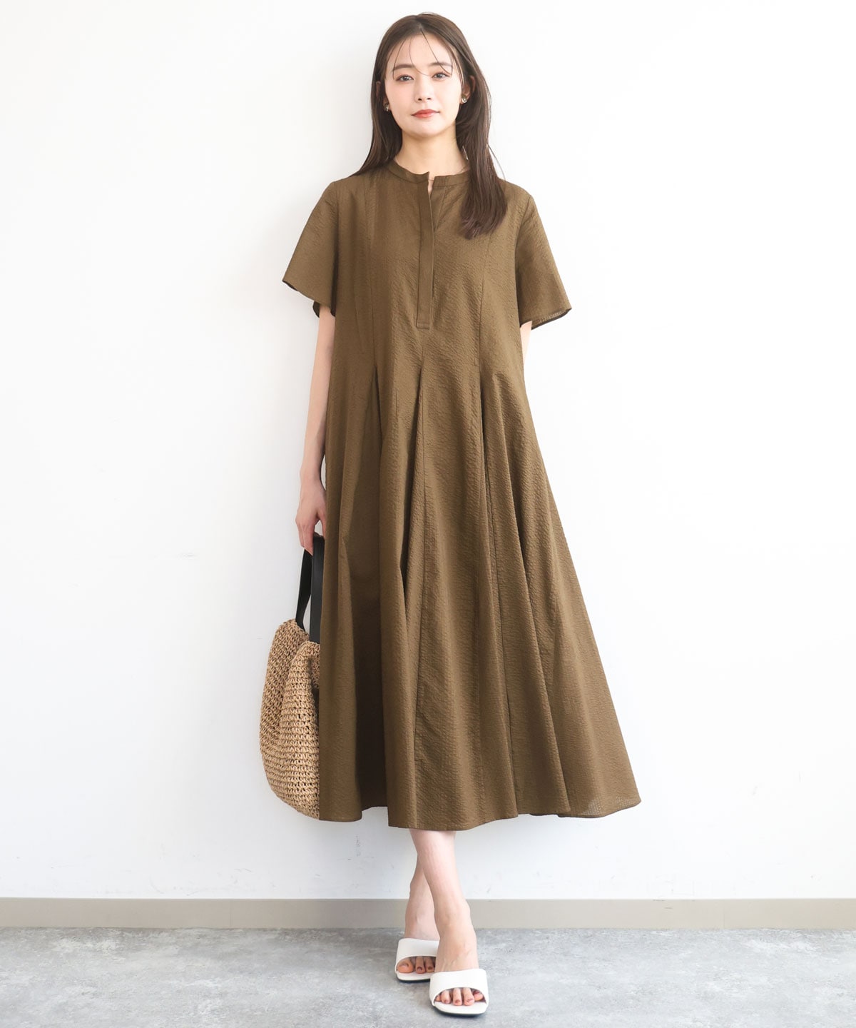 開きすぎないフロント襟元と二の腕をカバーしてくれるフレアスリーブが体型を気にしないで着こなしやすいデザインです。