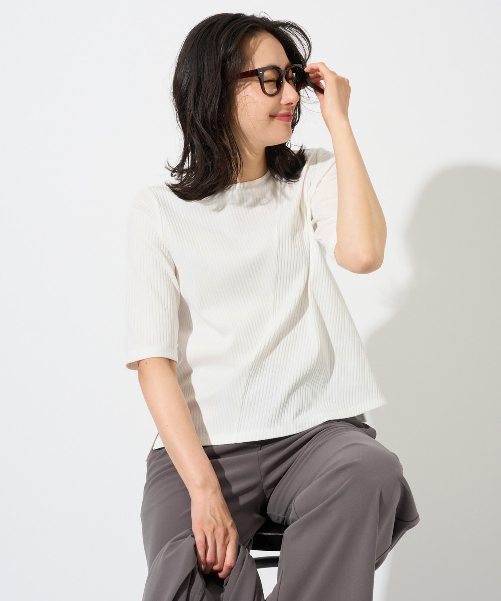バイヤスカットソーは、斜めの切り替えがボディラインをすっきり見せ、着るだけでスタイルアップ。柔らかなリブ素材が心地よくフィットし、デイリーに重宝します。
