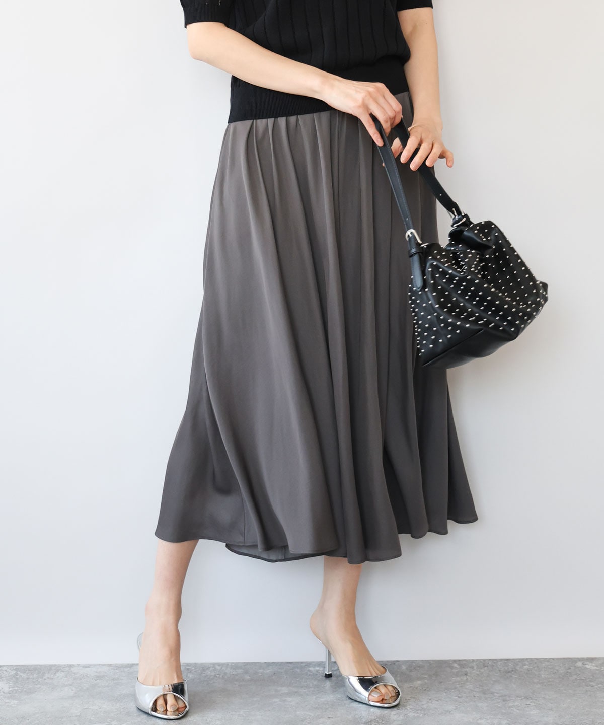 光沢のあるサテン素材がスタイリングに映える、MK定番のガウチョパンツです。素材は柔らかくなめらかなポリエステル素材でとっても軽く、動くたびにさらさらと揺れる軽さが素敵でした。表面にはテカテカしないくらいの上品な艶感があり、薄手ですが着用カラーは透け感は気になりませんでした。しわになりにくくご自宅でお洗濯可能なのもうれしいポイント。ウエストは総ゴム仕様で、ストレスフリーのはき心地です。