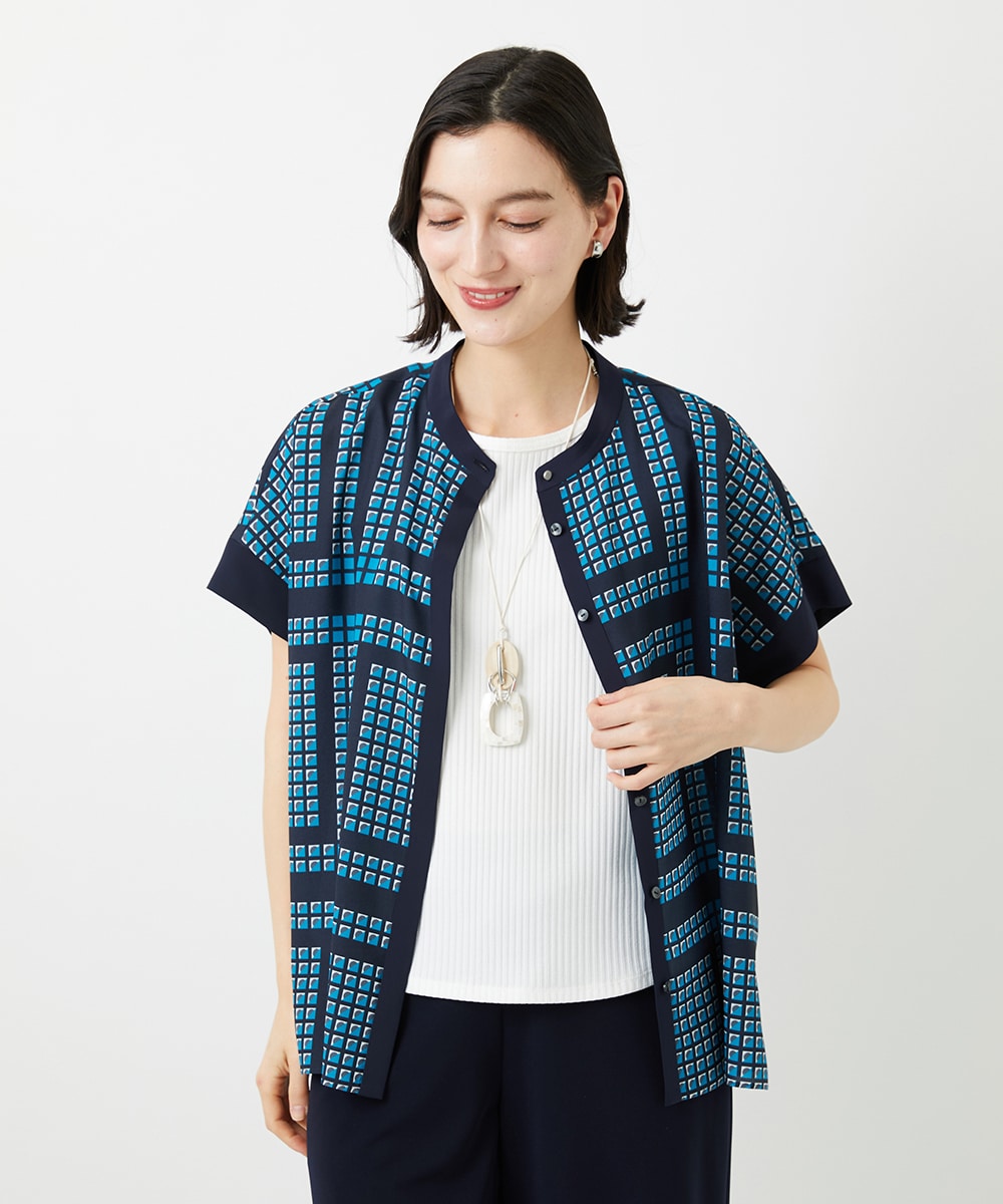 ブラウスはバンドカラーと前立ての配色がスッキリ見え!