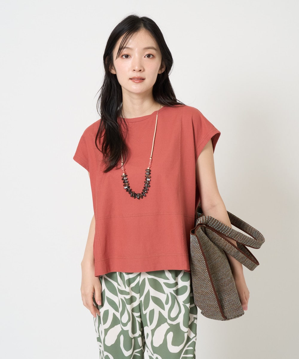 フレンチスリーブのカットソーは少しくすみのあるオレンジをチョイス。何気ないステッチがアクセントです。丈が短めなので足長効果 大です。
