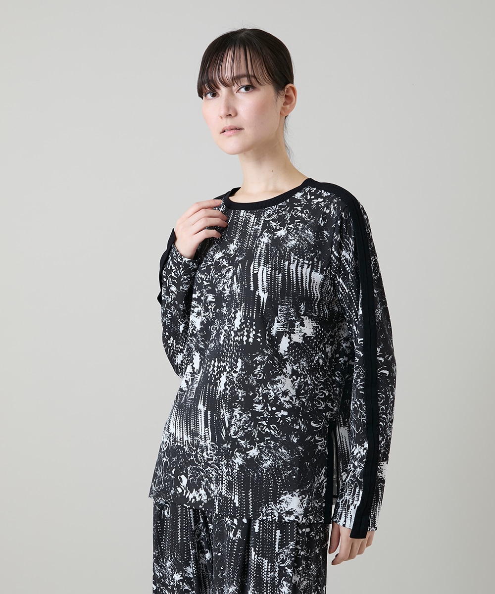 ヒロココシノらしいアートなモノトーンプリントのカットソーです。一枚で着てもさまになるアイテムです。サラッとした肌触りと程よい落ち感があるのでリラックス感がありながら上品さがあります。肩から袖にかけての立体感を感じさせるテープ使いが、腕をより細く長く見せます。高い伸縮性とシワになりにくいので旅行にもぴったりです。吸汗速乾加工があるので、汗をかいても快適な着心地です。