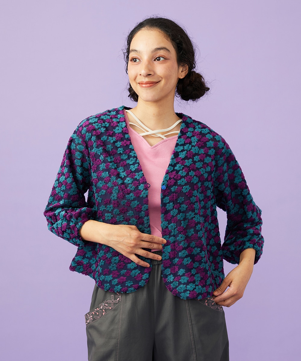 上品なシアー感のある花柄のパイルジャカードカーディガンは、襟元がすっきり見えるV開きデザイン。ラウンドした裾のデザインで開けても閉じても綺麗なシルエットに。袖口にゴムを入れ、腕まくりしやすく、シアー感のある涼しげなカーディガンです。