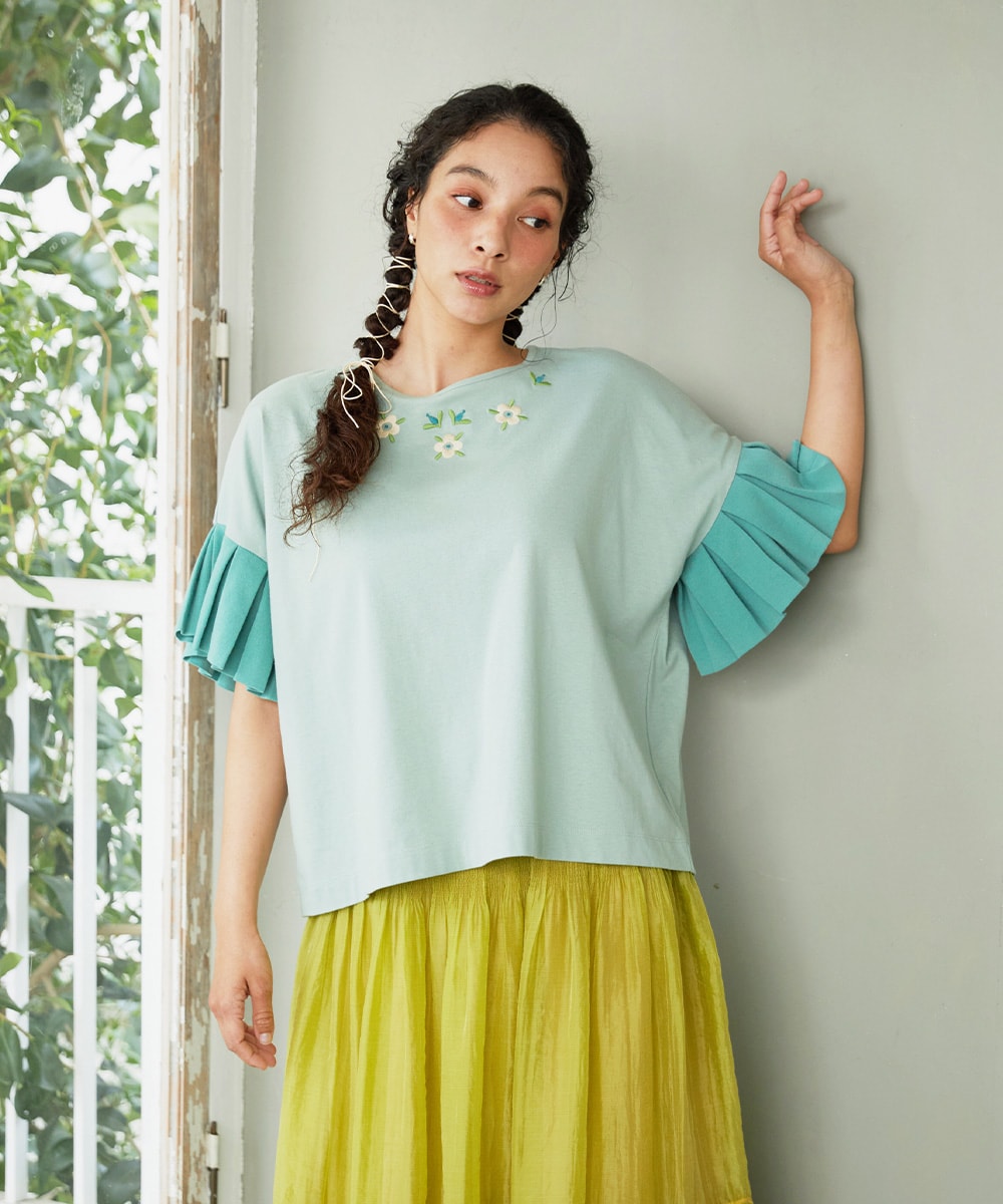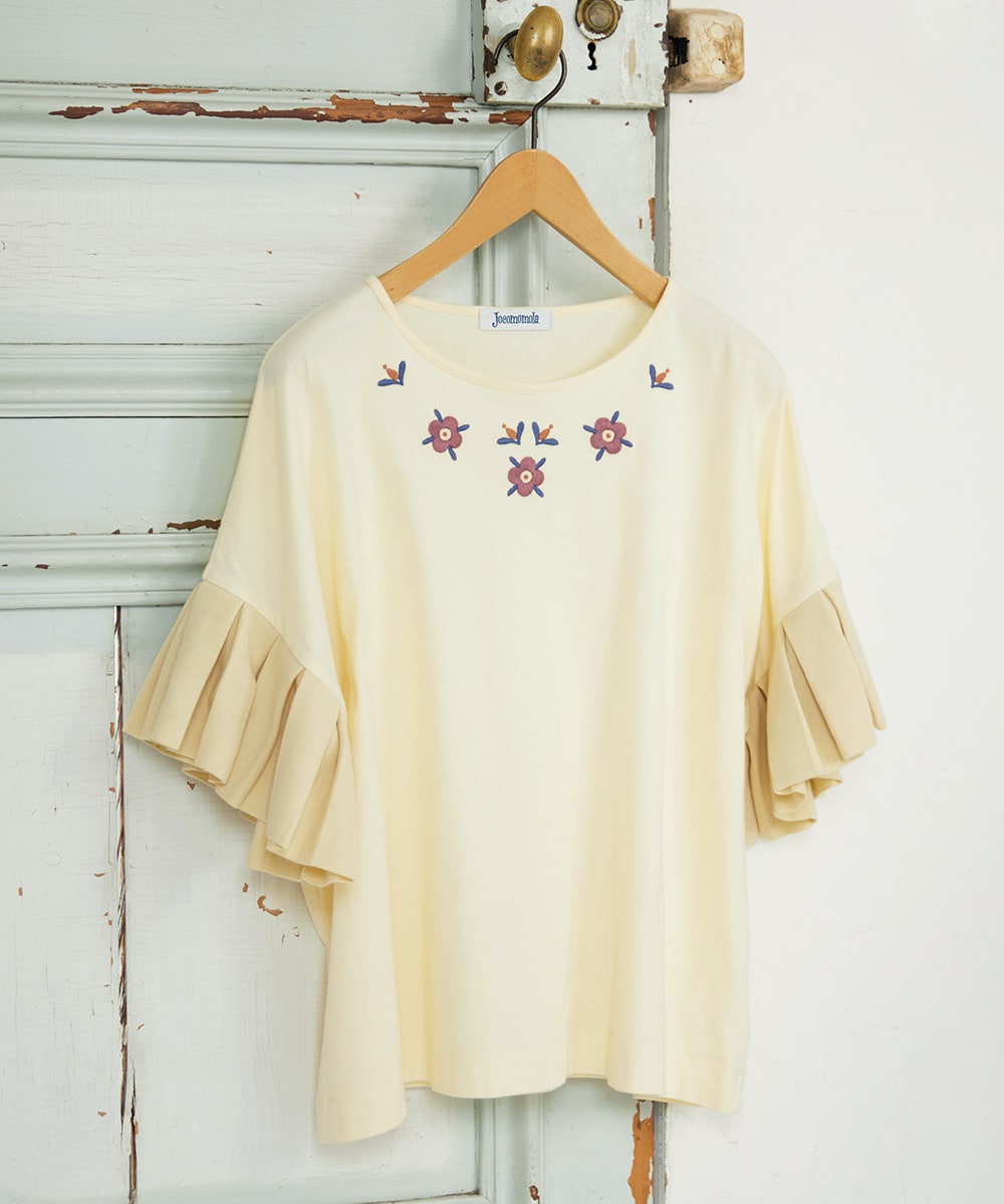 刺繍があるとアクセサリー要らずで顔周り明るくなるし、二の腕まったく気にならずで万能カットソーです。