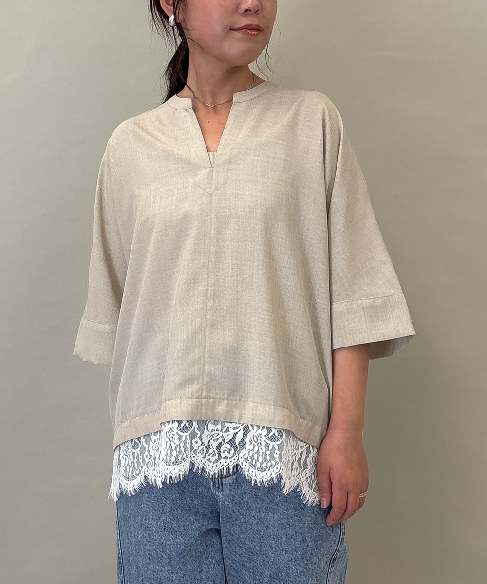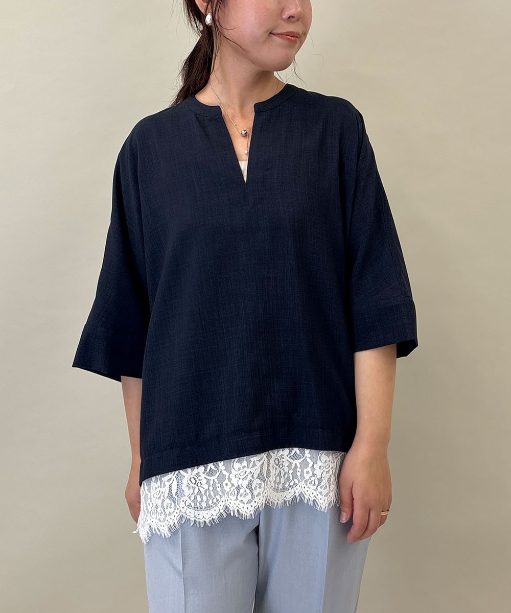 ブラウス:裾のレースが華やかなスリットネックのゆったりプルオーバーです。ボトムとの境目もヒップラインも隠してくれ、体型カバーになります。細身パンツもワイドパンツもどちらにも相性◎