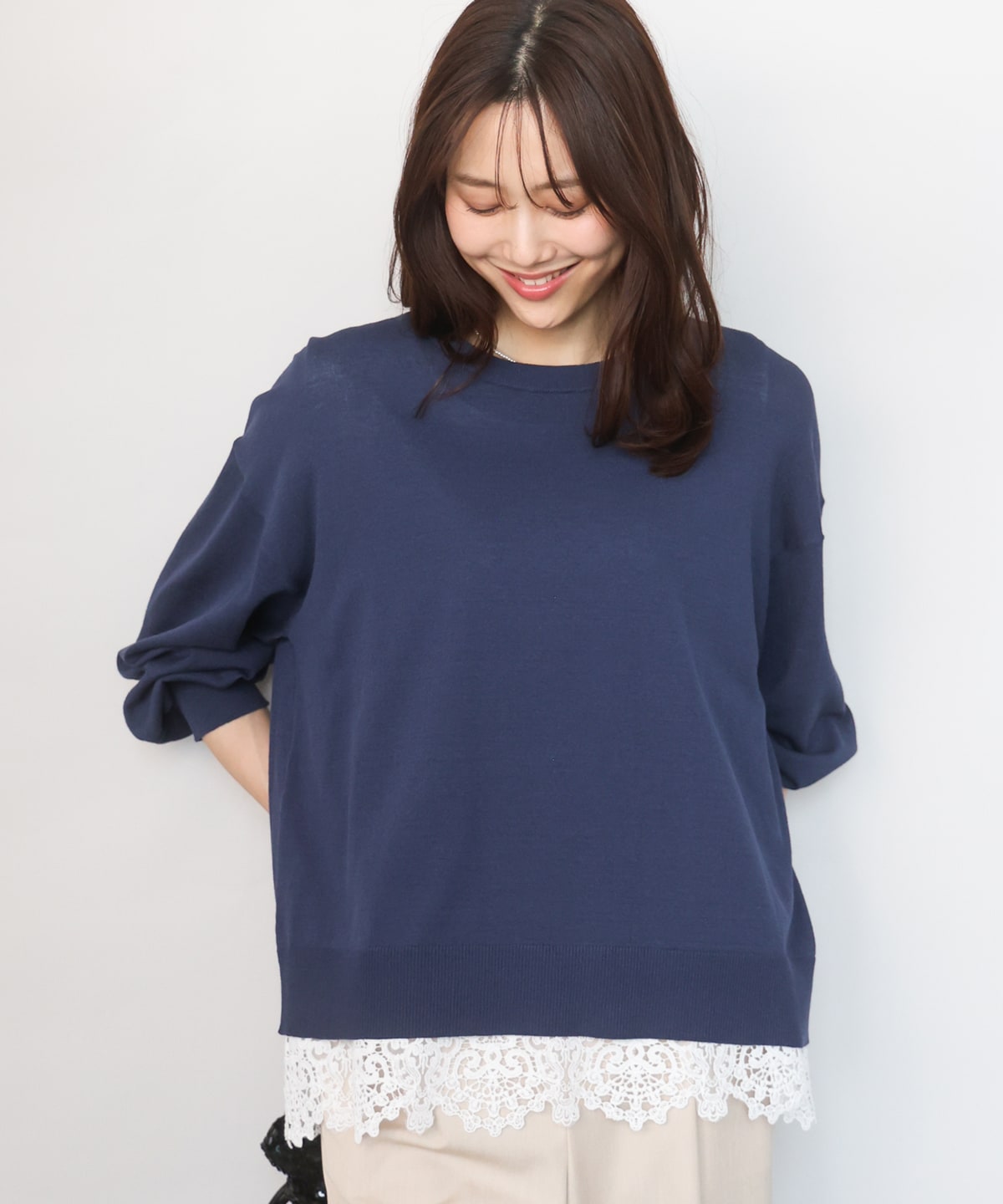 インナーは『ハイゲージニット×裾レースタンクトップセット』のタンクトップを合わせて、旬なレイヤードコーデにしてみました。