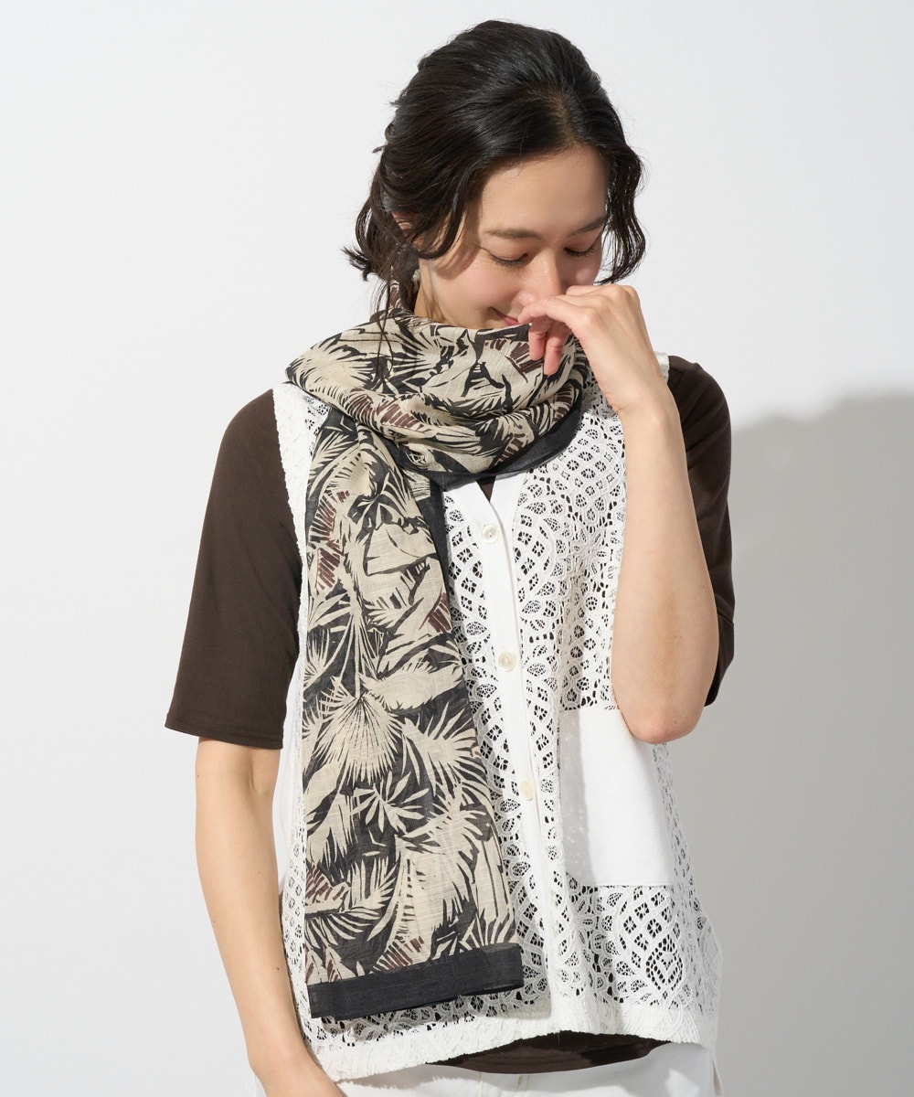 軽やかなシルク混素材のサファリリーフプリントストールをスカーフ代わりに合わせると、コーデにポイントをプラス。