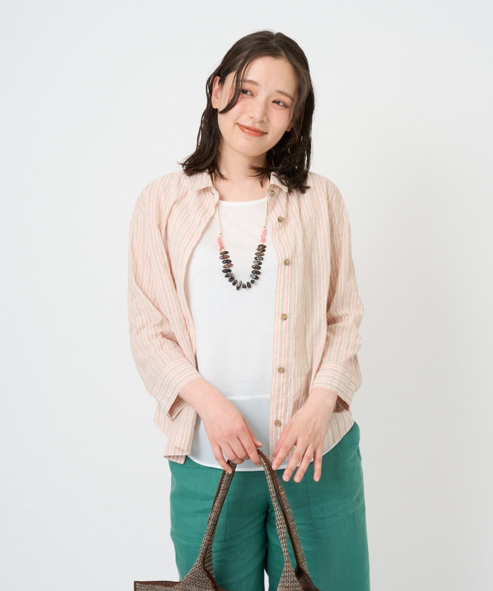 ストライプシャツは軽やかなリネンコットン素材で、着るだけで自然なリラックス感をもたらします。