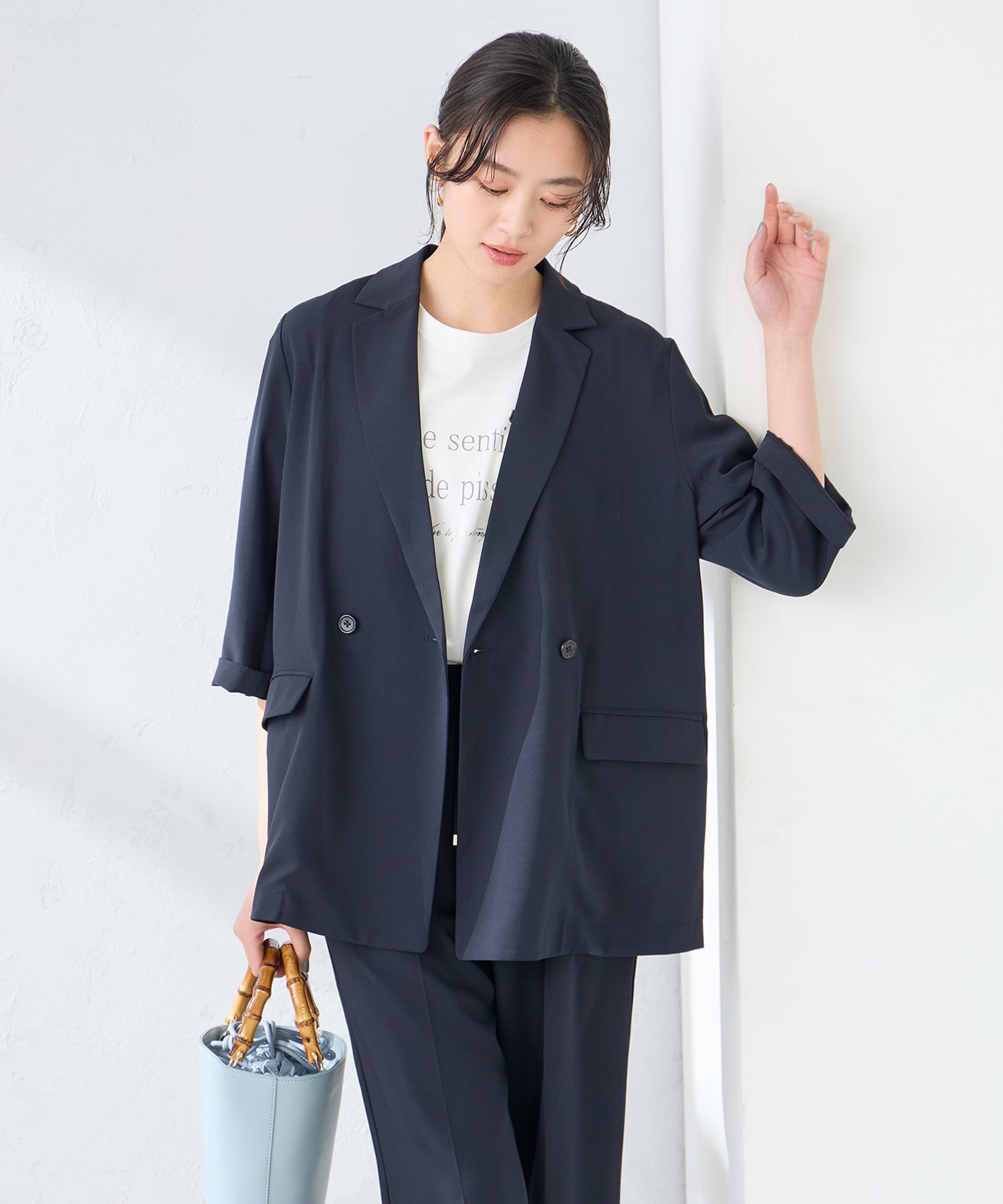 同素材パンツとのセットアップ着用がおすすめです