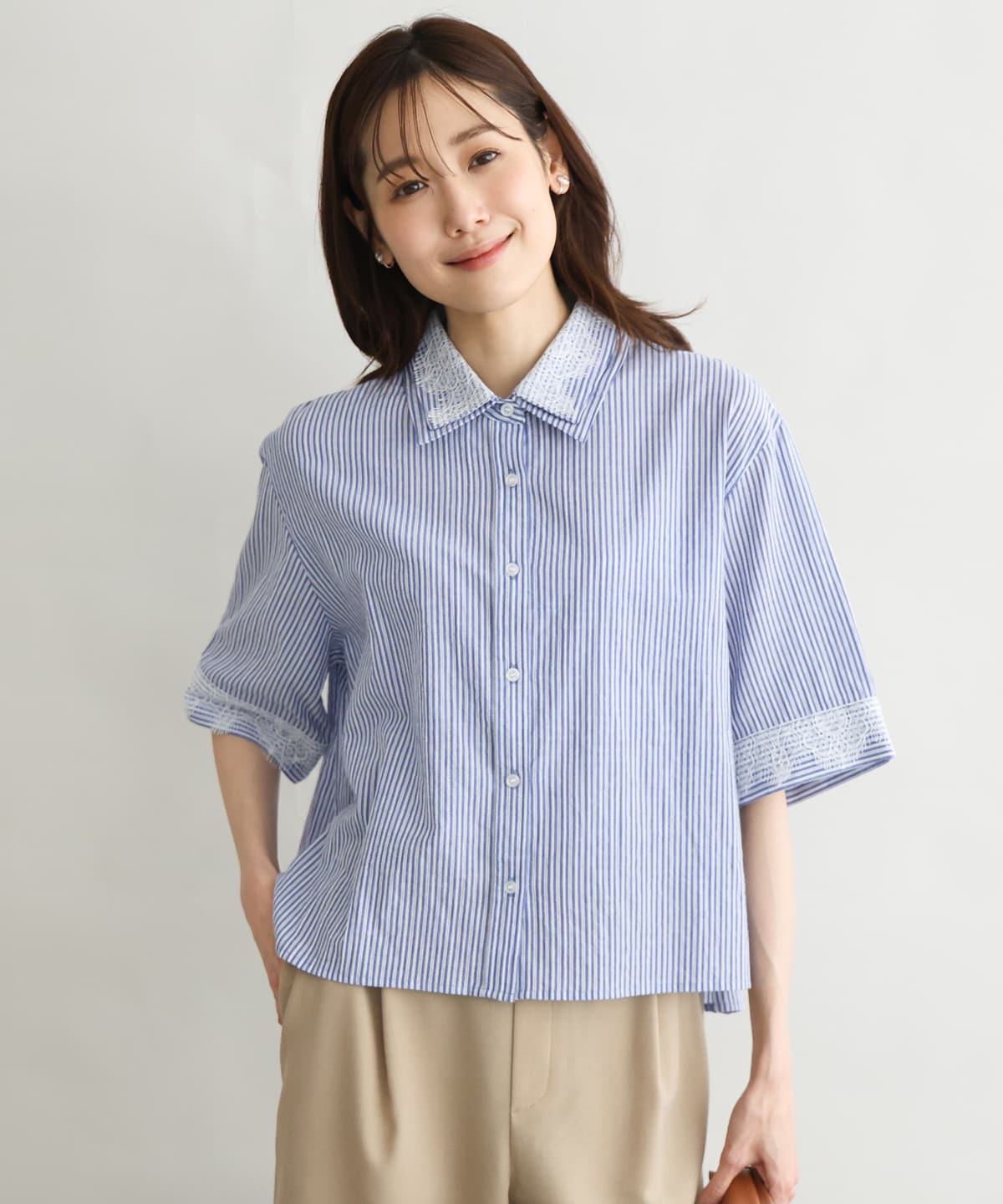 〈ストライプレース五分袖シャツブラウス〉