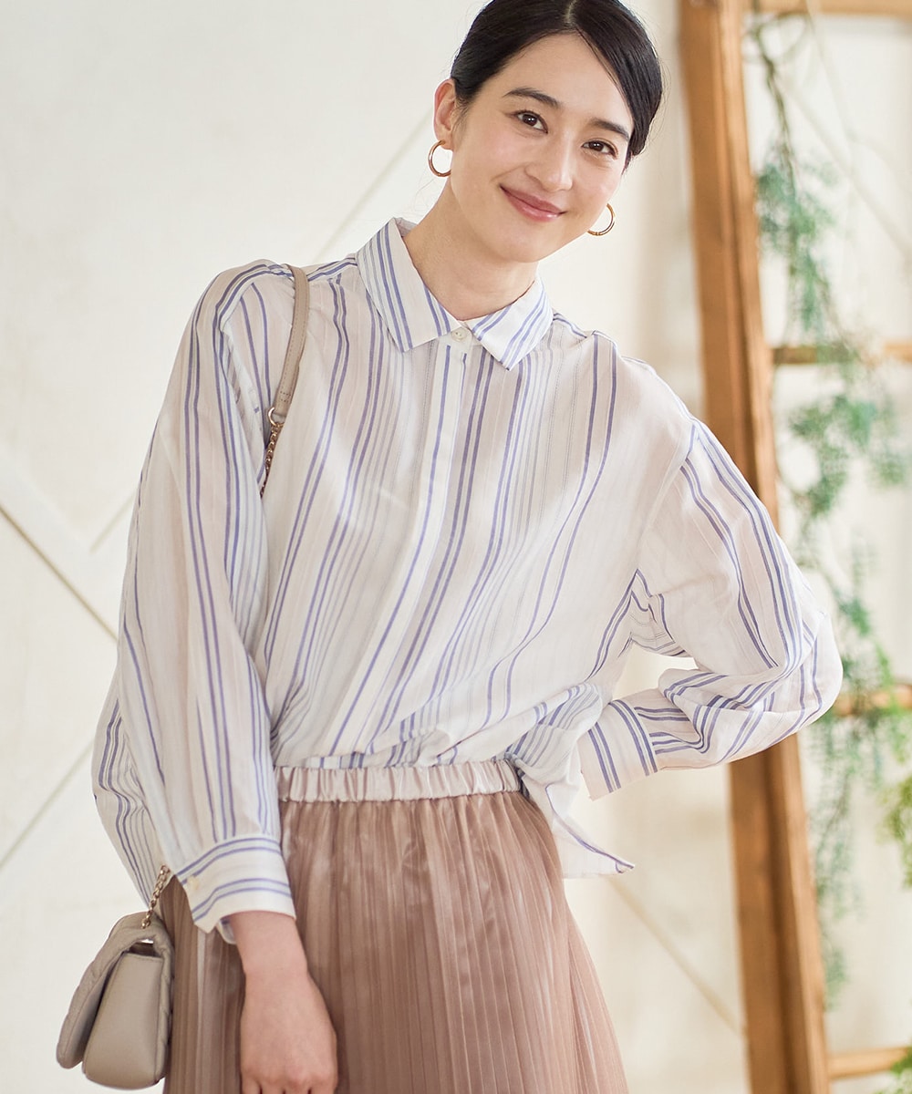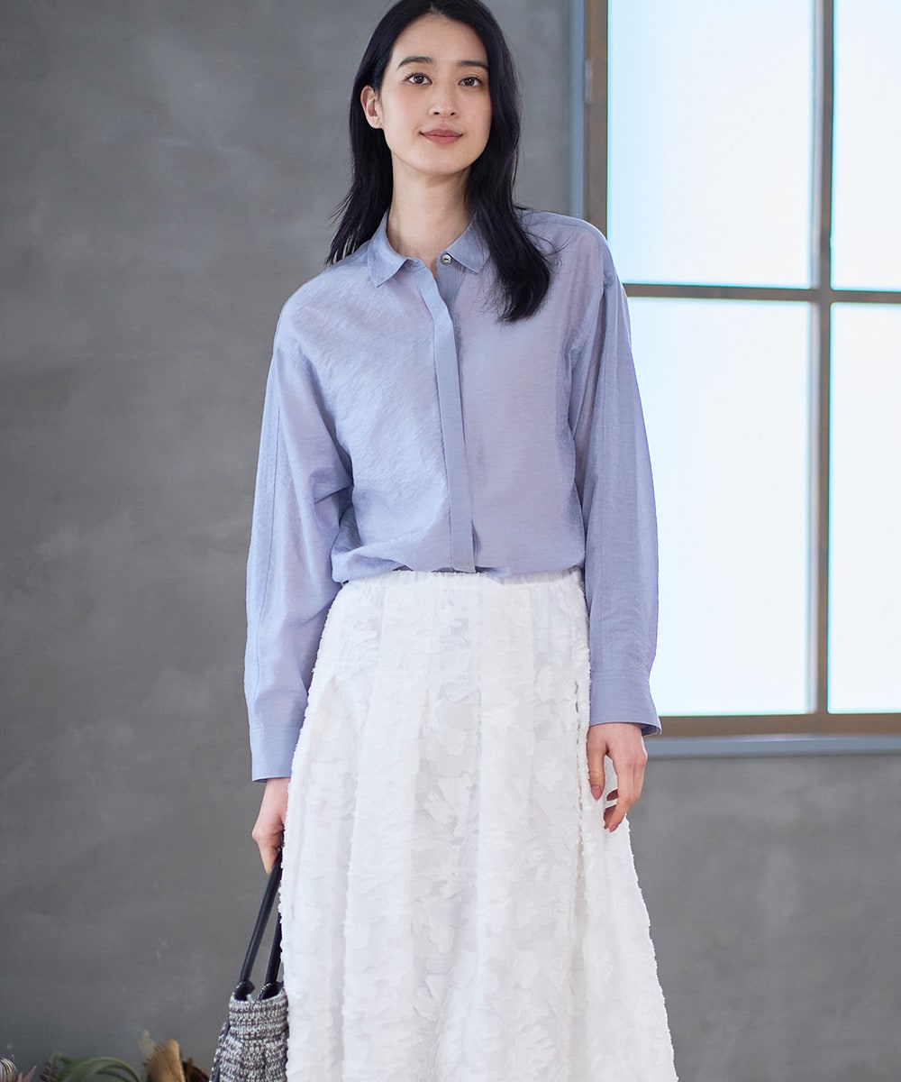 着用感:ゆっくりとしたサイズ感です。とっても軽くてストレスフリーです。大きめの襟が可愛い♡シワになりにくいのでクルクルッとバッグに入れてもOKです!!旅行にも最適♪♪