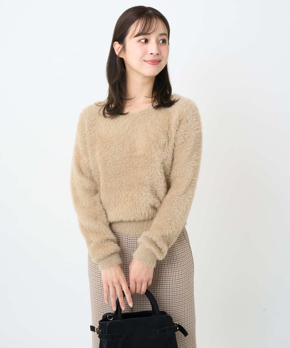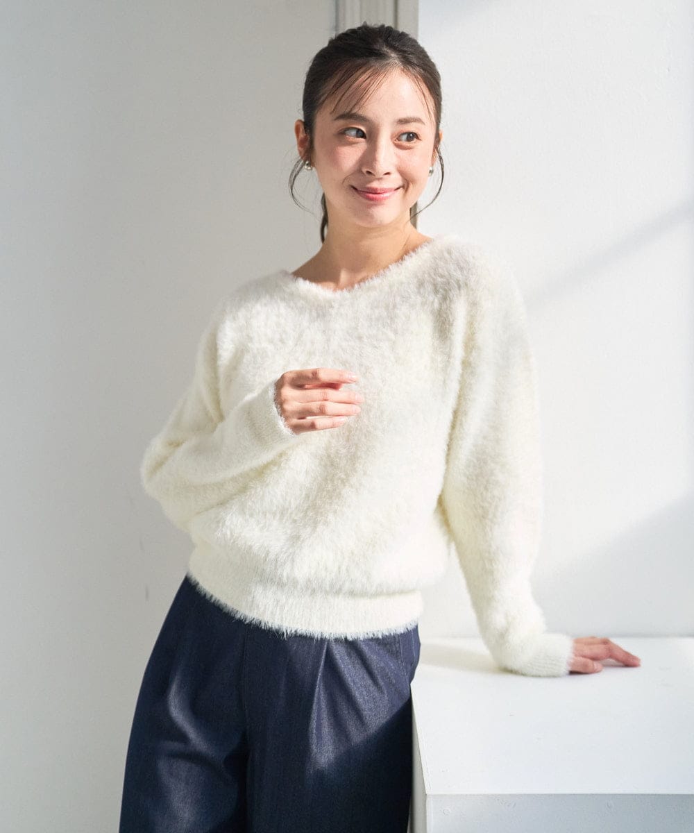 デコルテラインをすっきり見せる丸みのあるVネックを前にして着用しています。