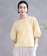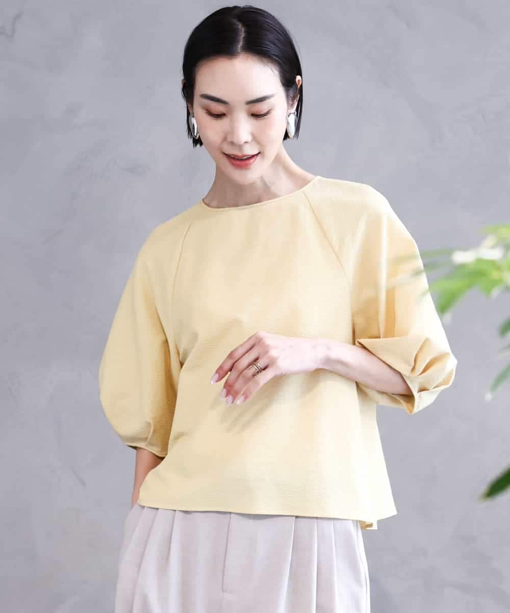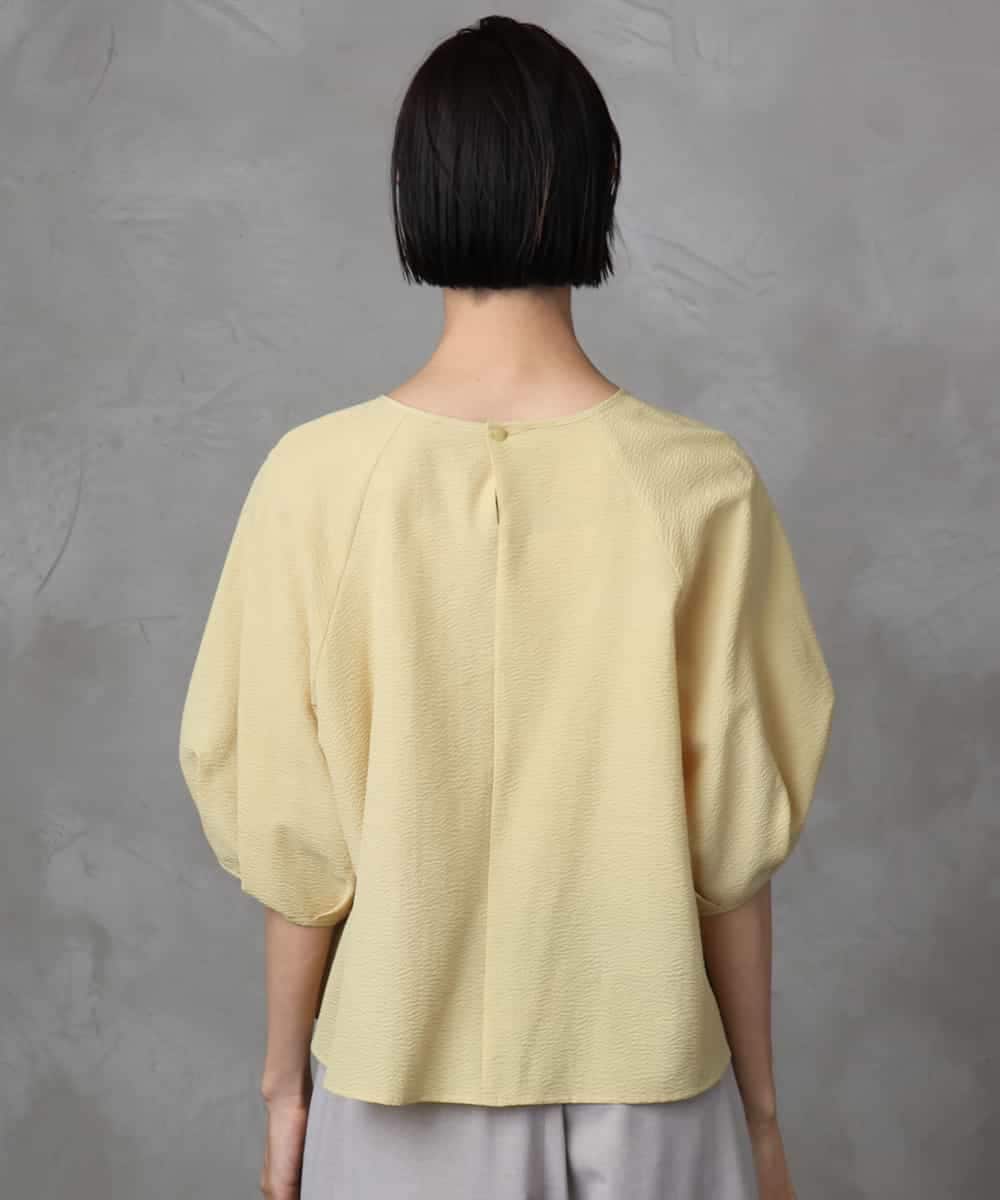 素材の特性を活かした構築的なフォルムのパフスリーブがモダンなデザイントップス
