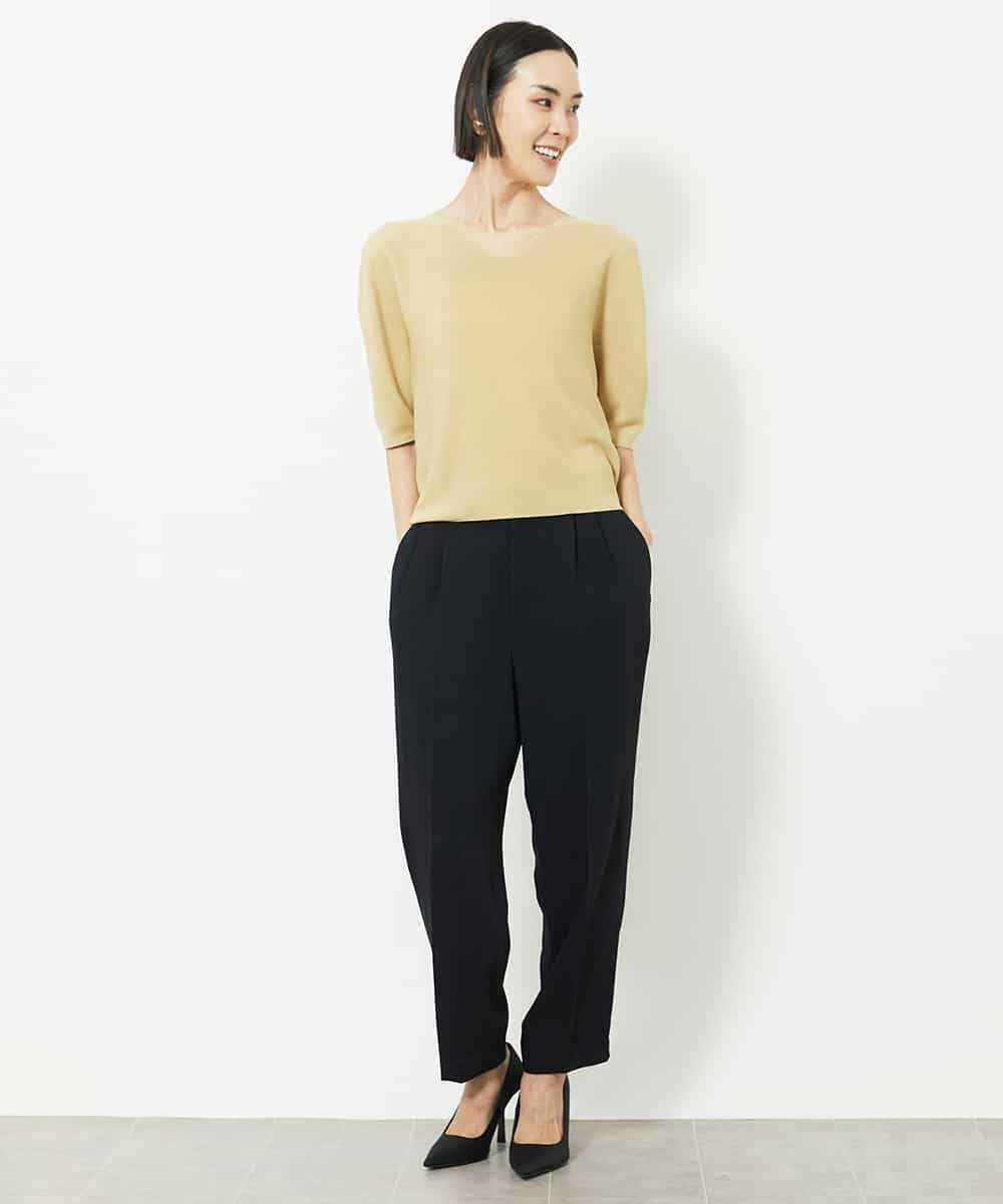 自然に細くなるシルエットは体型を優しくカバーしながらすっきりとした印象に