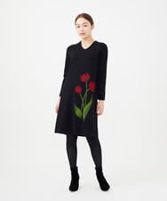ニット素材アップ:メリノウール100%のニット素材。ソフトで上質さを感じるふっくらとした風合いが特徴です。 モチーフ部分は、ニードルパンチを施した後、さらにハンドステッチで刺繍をプラス。
