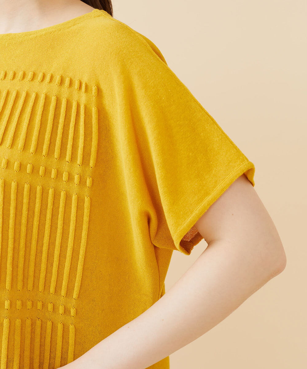 ニット素材アップ:綿のソフトでしなやかな風合い、リネンの持つナチュラルな表情と清涼感に、光沢を抑えたポリエステルフィラメントが加わった、さらりとしたマットな質感です。