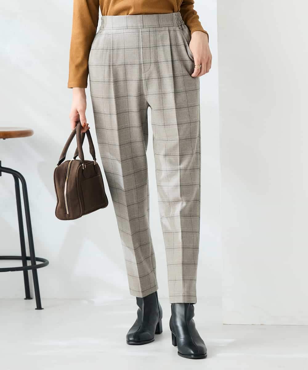 【イージーケア/洗える/ストレッチ】裏起毛美ラクるスッキリ見えチェックテーパードパンツ