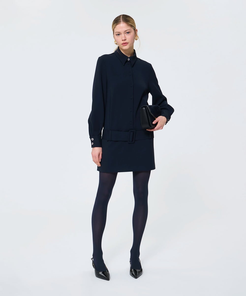 幅広のベルト付きデザインと、ロー切り替えのスカートで大人っぽさを演出。