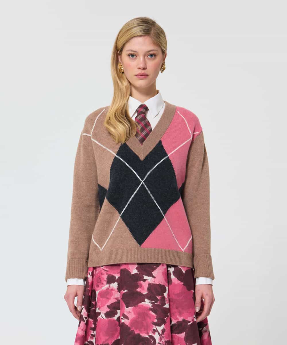 ◆デザイン◆TARA JARMONらしい配色のアーガイル柄が目を惹く、Vネックのプルオーバーニット。