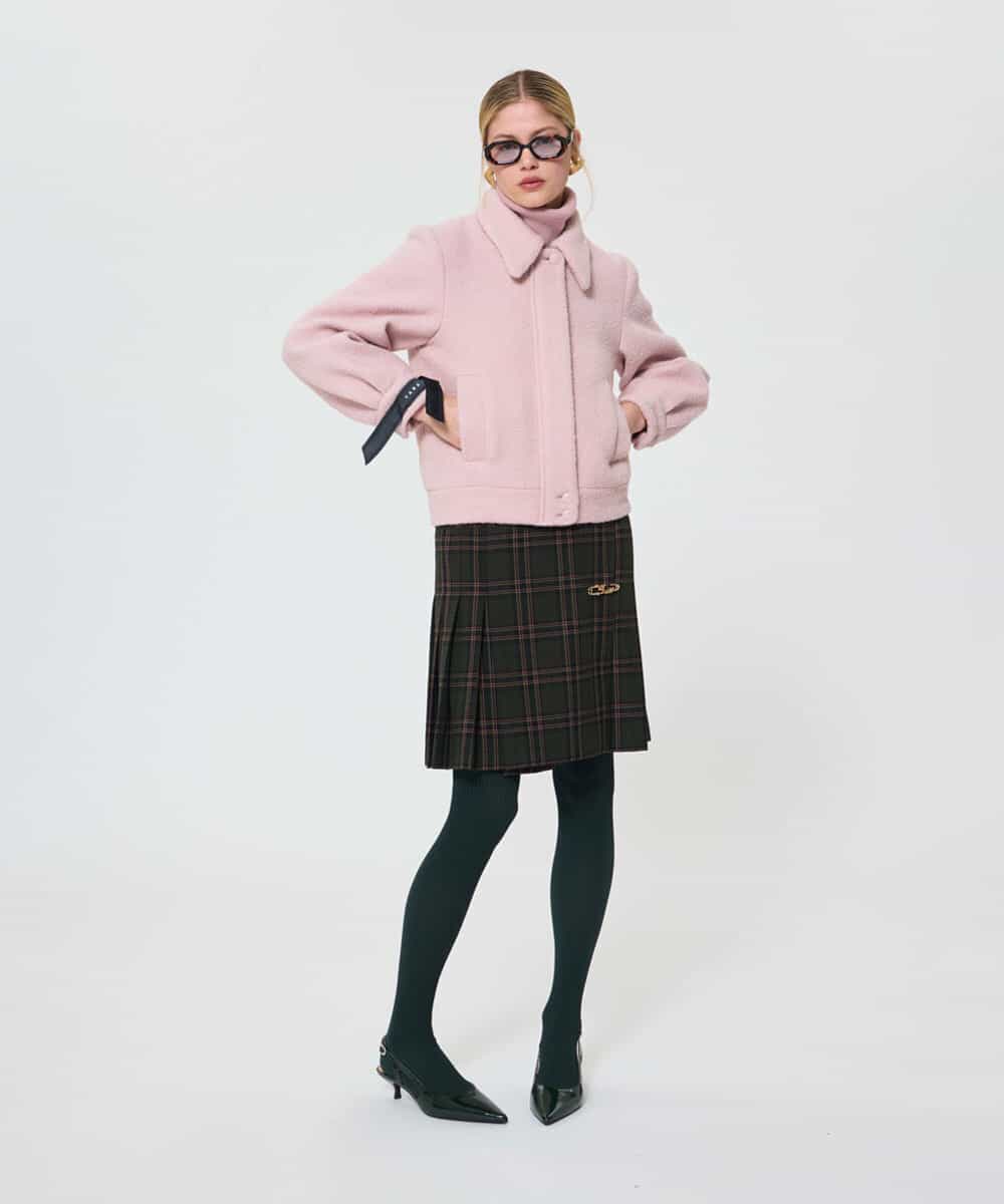ブルゾンライクなデザインに、可愛らしいピンクカラーと袖口のリボンでフェミニンさをプラス。