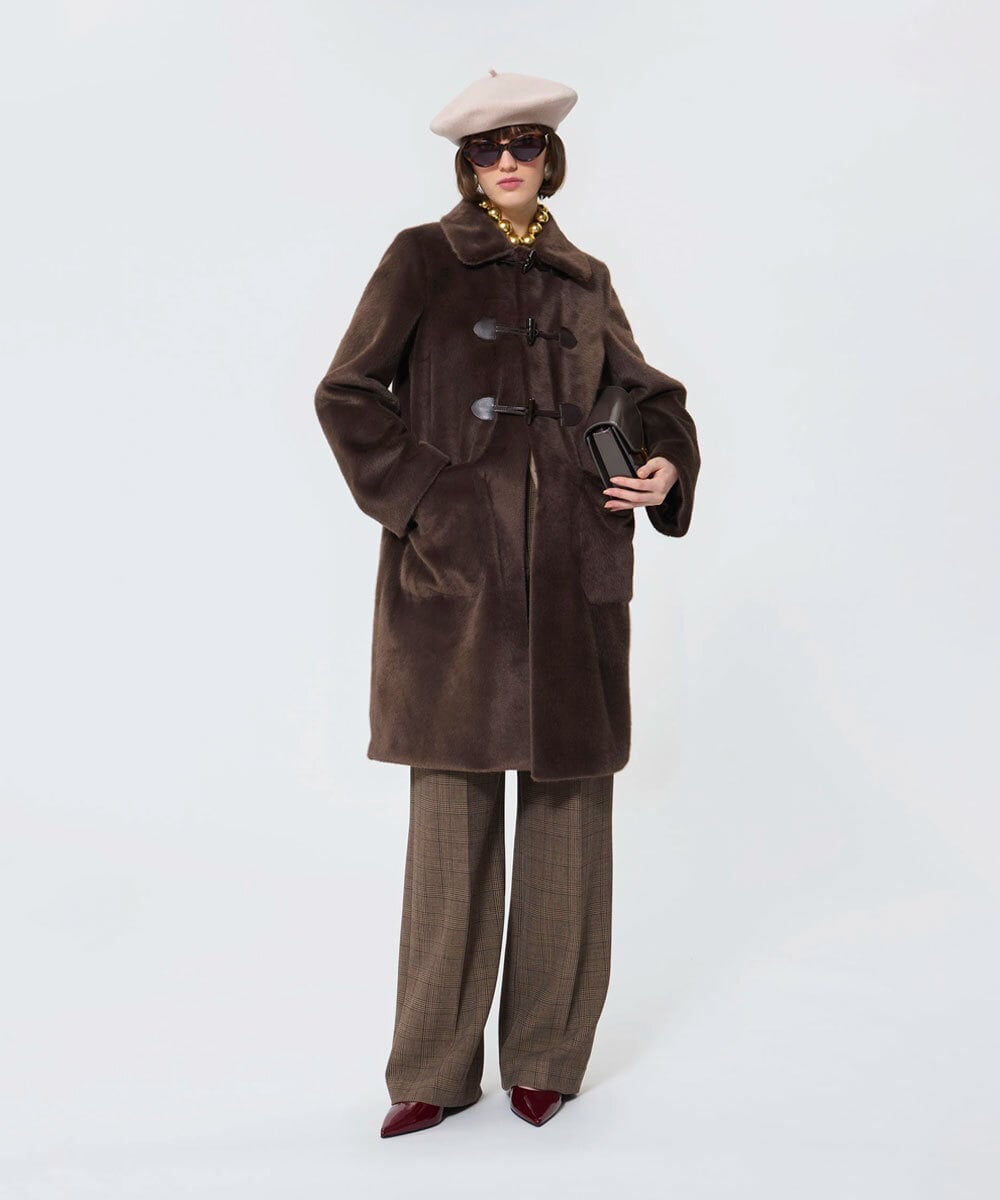 ◆デザイン◆ふわふわとした柔らかな感触と、美しい光沢が心地よい、エコファー素材のダッフルコート。