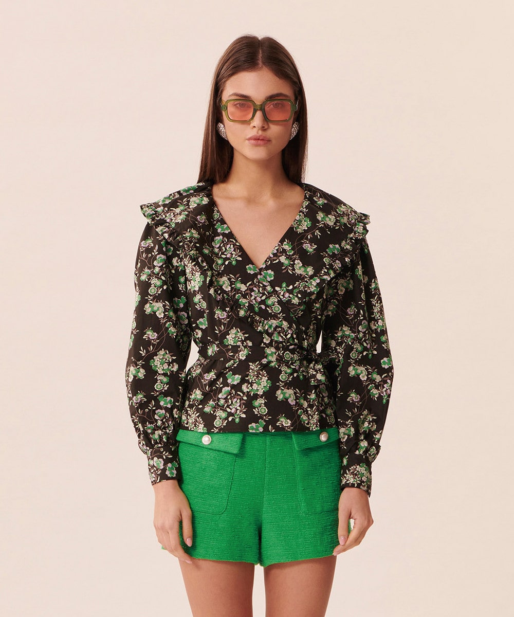 ふわっとしたボリュームスリーブと手首を華奢に見せるロングカフス、二連ボタンがTARA JARMONならではのデザイン。