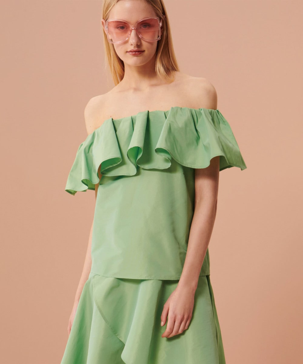 ネックラインがゴムシャーリングになっているので、肩を落としてオフショルダーとしても着用可能。