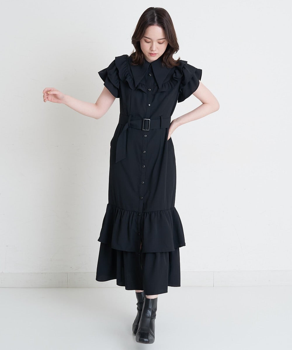 トレンドのビックカラーに、身頃や袖のフリルがかわいいワンピース。