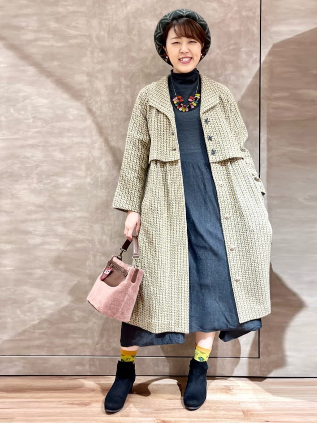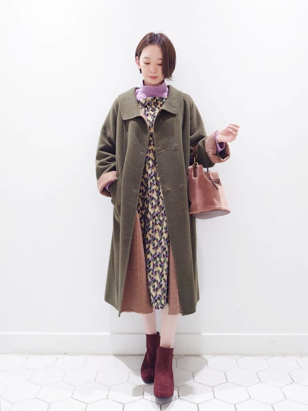 シンプルな無地ワンピと合わせれば、コートの柄がぐっと映えるスタイリングに。よりクラシカルでレディライクな印象にまとまります。