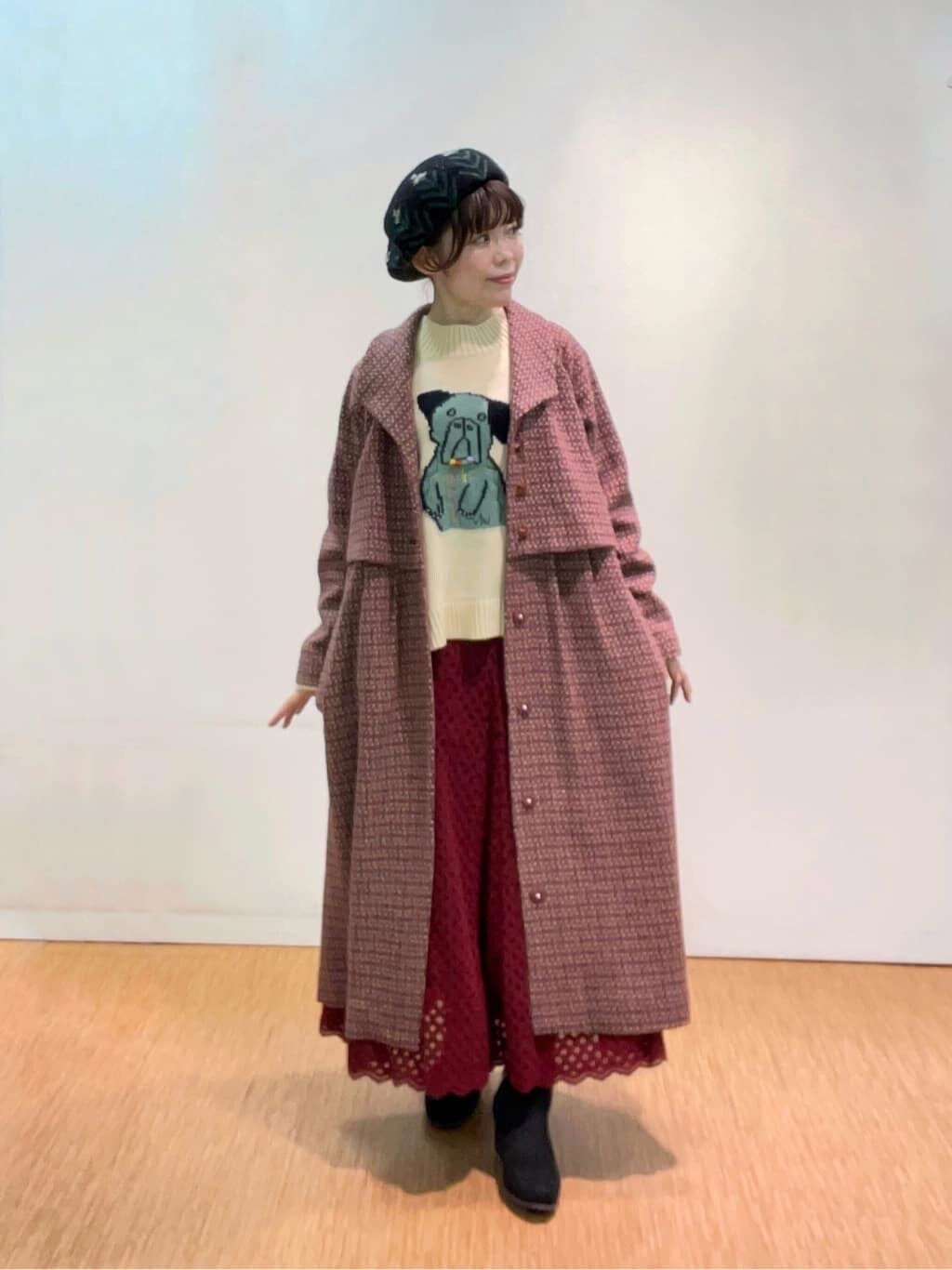 コートと同系色の赤のボトムを合わせたコーデ。裾からちらりと覗くレースボトムはドビーロングコートとの相性◎。