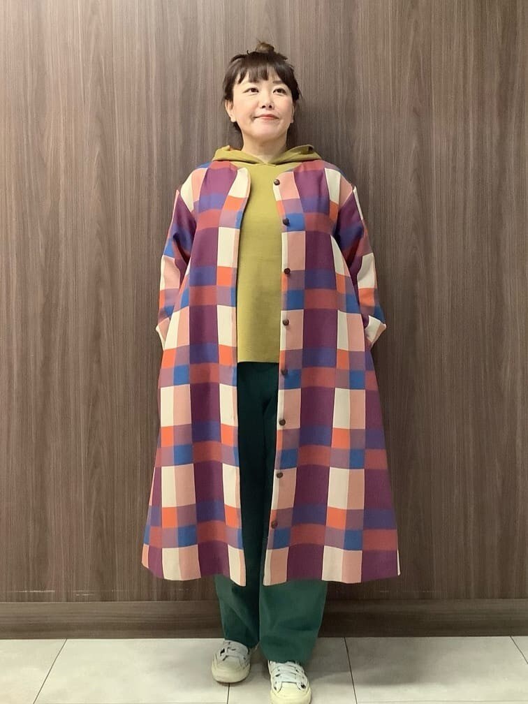 アウターからフードをのぞかせるレイヤードも楽しい一枚です。柄コートを脱いでもカラーリングが楽しいオススメコーデです。