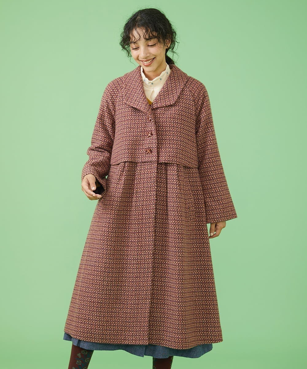 毛織の名産である尾州で作成した生地で、6色の糸を使用し細かな柄のドビー組織で織り上げました。トレンチコートのような被せヨークがポイントのロングコートデザインです。後ろ襟ぐりのギャザー効果でふわっとしたシルエットになり優しい印象に。ヨークの下に施されたタックが女性らしいエレガントな雰囲気を演出します。